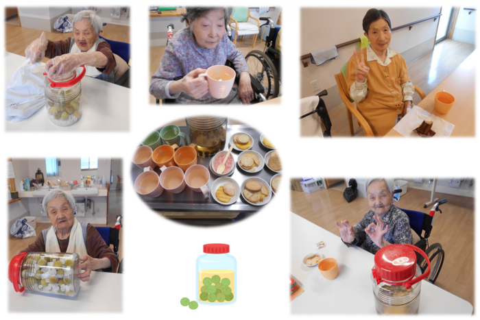 以前、ご利用者様と一緒に作った梅ジュースが、良い感じに漬かったので、おやつの時間に飲みました。「飲みやすくておいしいね」「懐かしい味だね」と、おおむね好評でしたが、一部から「ジュースより梅酒が飲みたい」との声も・・・もし機会があれば次回ということで・・・^^;