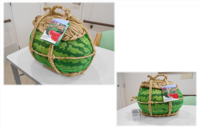 業者さんから大きな西瓜をいただきましたが、あまりの大きさに職員もビックリ!そのままでは冷蔵庫に入らないので、カットする前に記念に撮りました^^