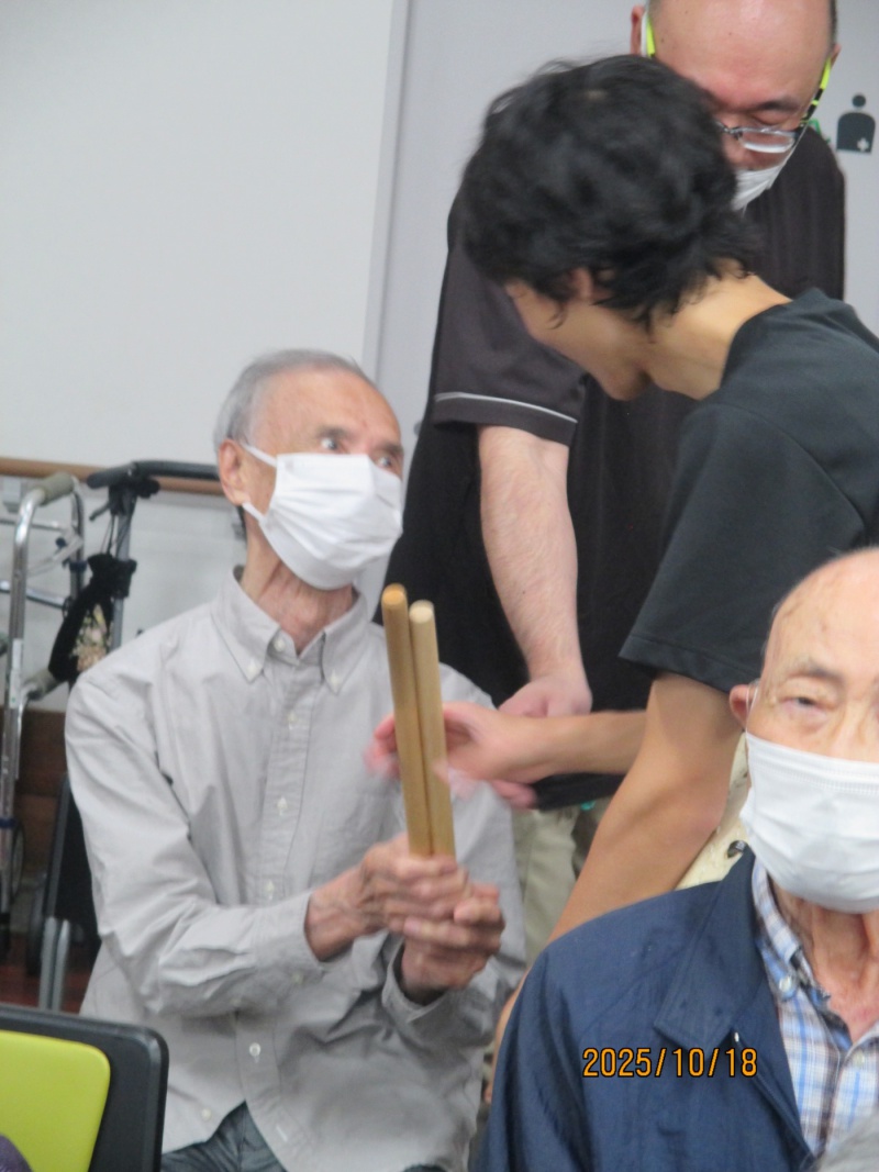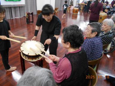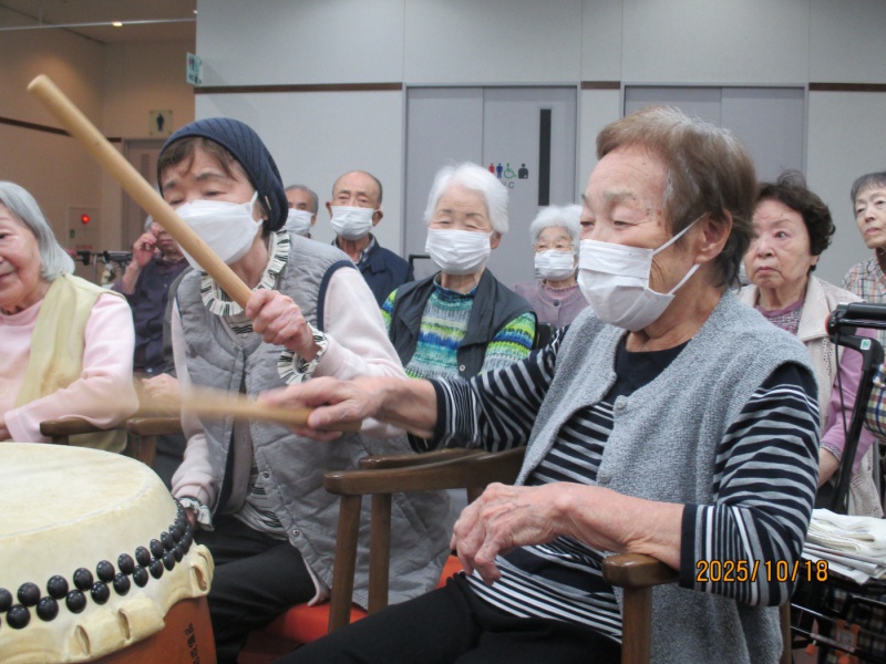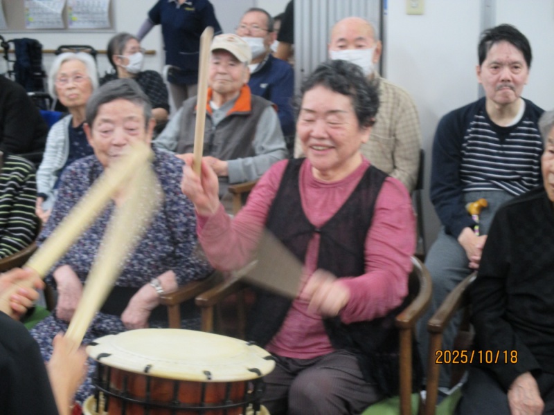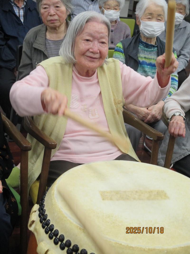 「すごかった。上手に叩けていたね、ありがとう」と話されたり、和太鼓を叩きませんか?と声掛けすると楽しそうに叩いていました。