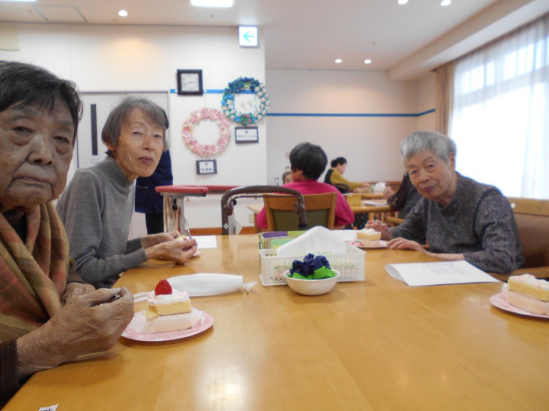 そしてお楽しみのケーキの時間になると、「美味しいー」と話される方が多く、口にクリームを付けながら他の方と話されていたり、ケーキを笑顔で頬張る姿が見受けられました。「このケーキの飾り持って帰っていい?」と話される方もいてそれぞれ楽しまれていました。