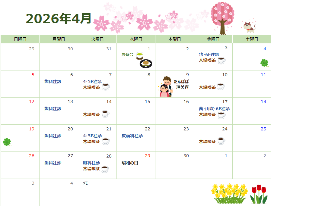 1階外苑にて桜を観賞 施設敷地内に咲いている桜を観賞しました。今日は天気も良く、絶好のお花見日和でした。 掲示板...