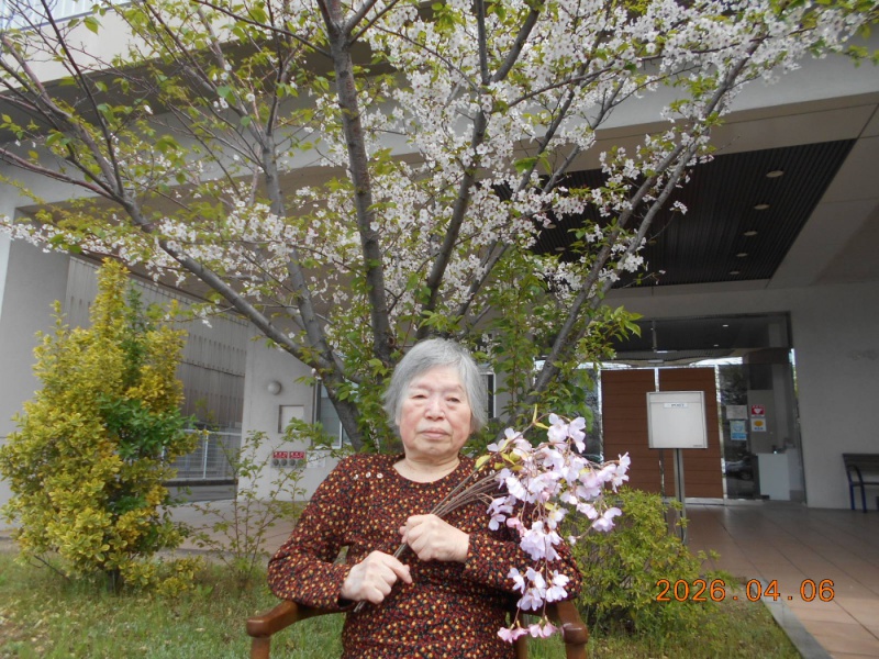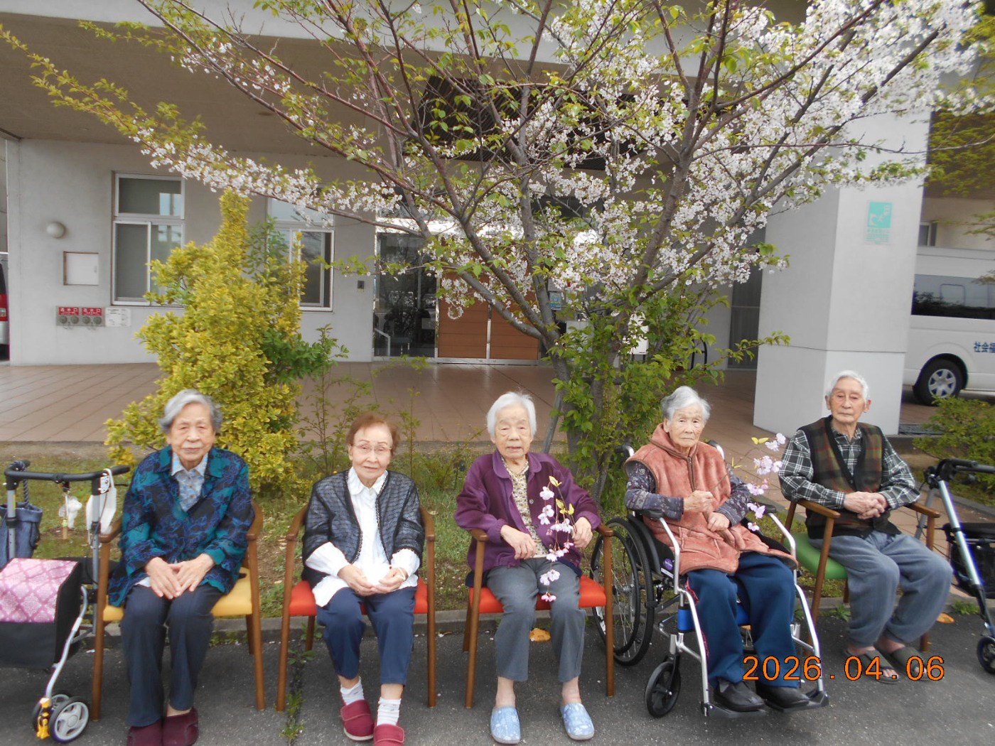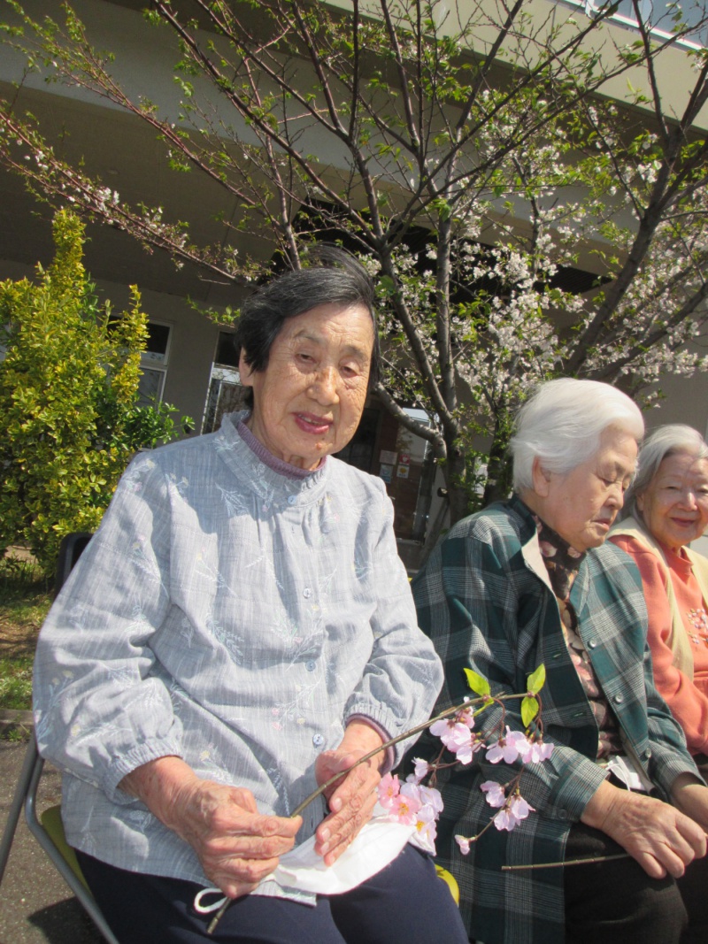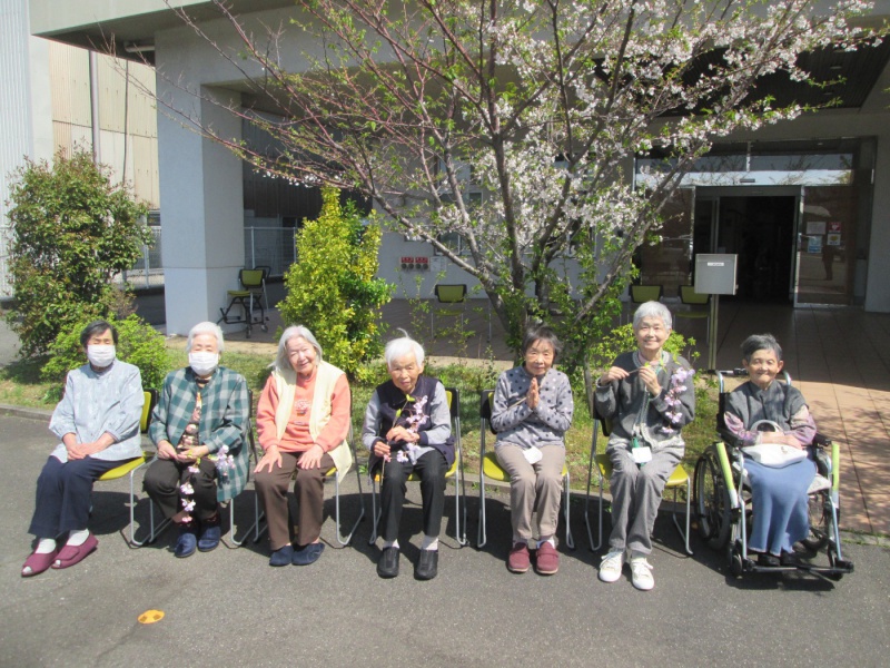 施設の玄関前で観桜会を開催しました 桜を見て「きれいですね」と笑顔で言われていました。 桜を観賞後、桜を背に写...