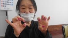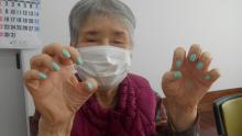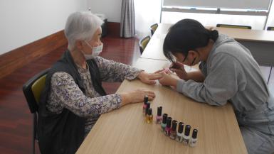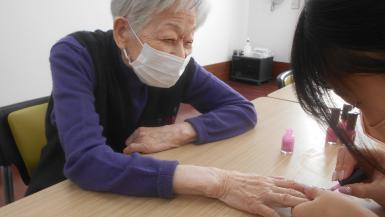 大学生さんがボランティアに来られ入居者様にマニキュアをしてくれました。 希望される色のマニキュアを塗りながらマニキュアについての説明をしていただきました。 とても話し上手で皆さん楽しい時間を過ごされました。 「何十年ぶりにしました」「派手すぎない?」と皆さん笑顔でいきいきと話されていました。
