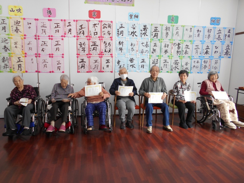 書き初めコンクールの表彰式を行いました。 「こんな立派な賞状もらったの初めて」と皆さん笑顔でした。 「手が震えて書けない」と言われる方もいらっしゃいましたが、職員が支えて書くことで上手に書かれました。 賞状が足りないくらい素敵な作品が多かったです。 入選した皆様、本当におめでとうございました。