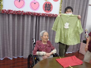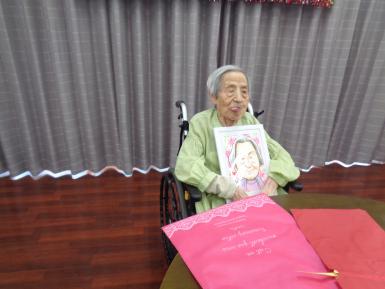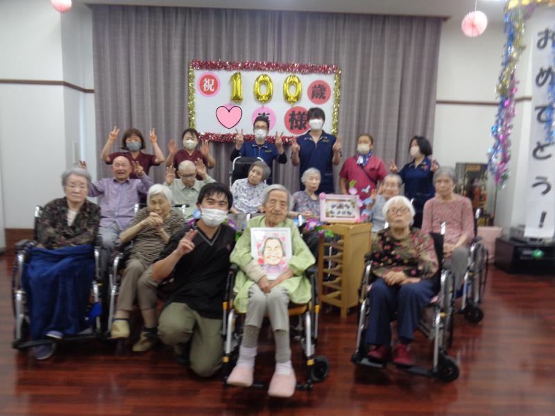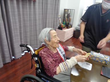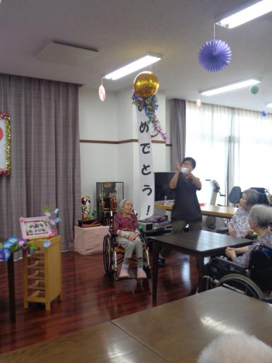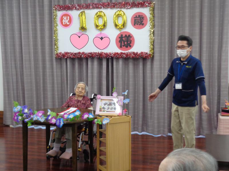本日、100歳の誕生日を盛大に祝いました。 施設長のお祝いの挨拶です。