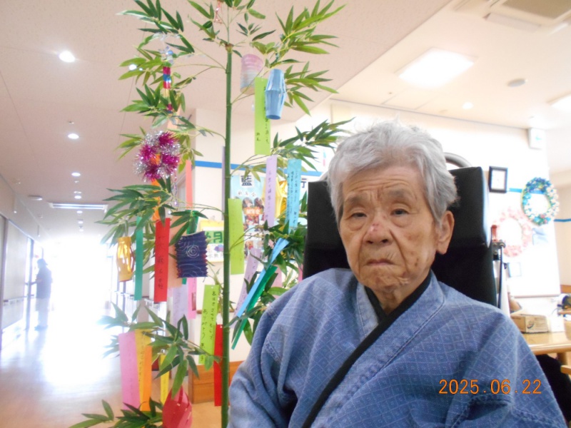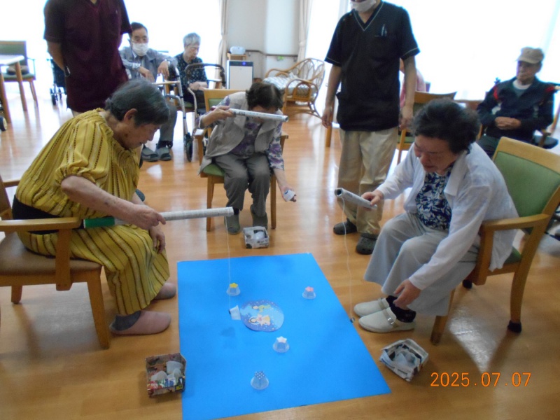 天の川を見立てた画用紙に星の形の容器を何個も置き、釣った数を競いました。思っていた以上に上手く竿を動かして釣り上げ、なかなかの接戦で盛り上がりました。また、一人一人みなさんの前で願い事を発表し、願いが叶うよう拍手し応援されていました。