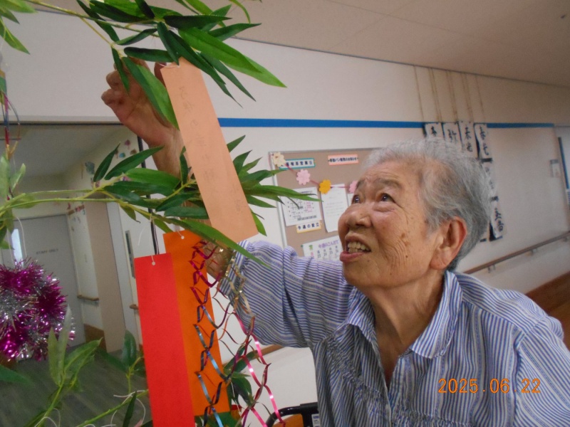 みなさん各々の好きな場所に短冊を飾りつけをして「ここがいいかな」「向こうの方がいいかな」と迷いながら飾りつけをしている様子でした。