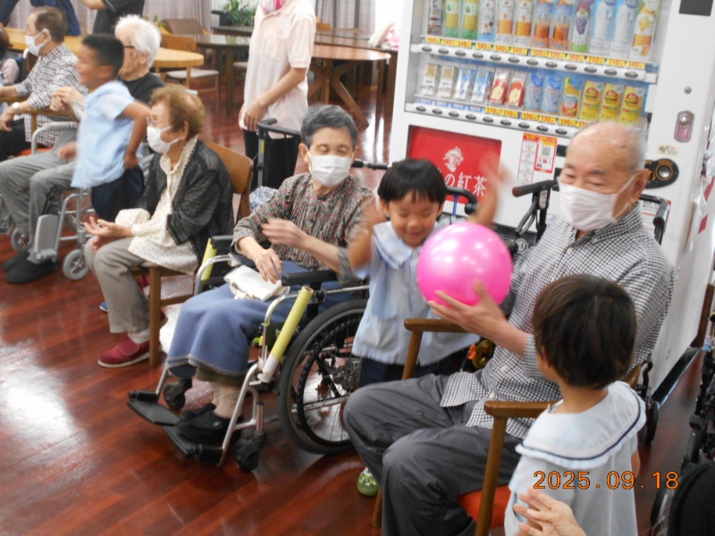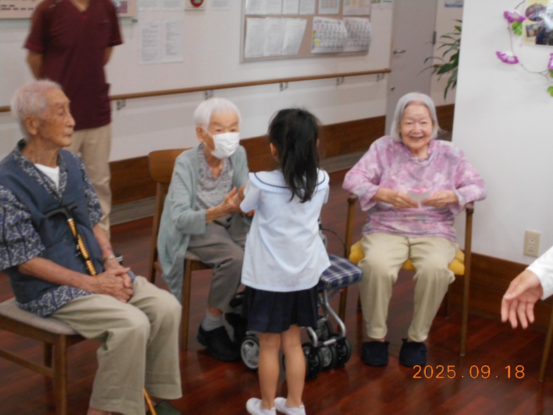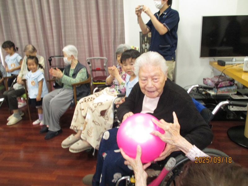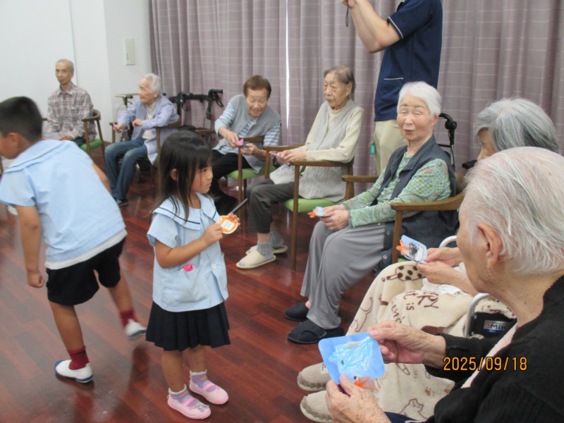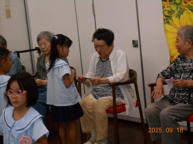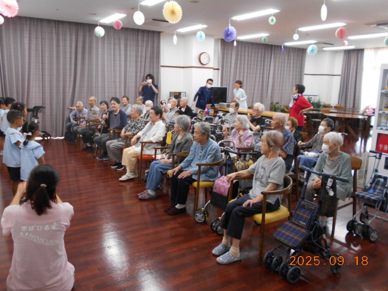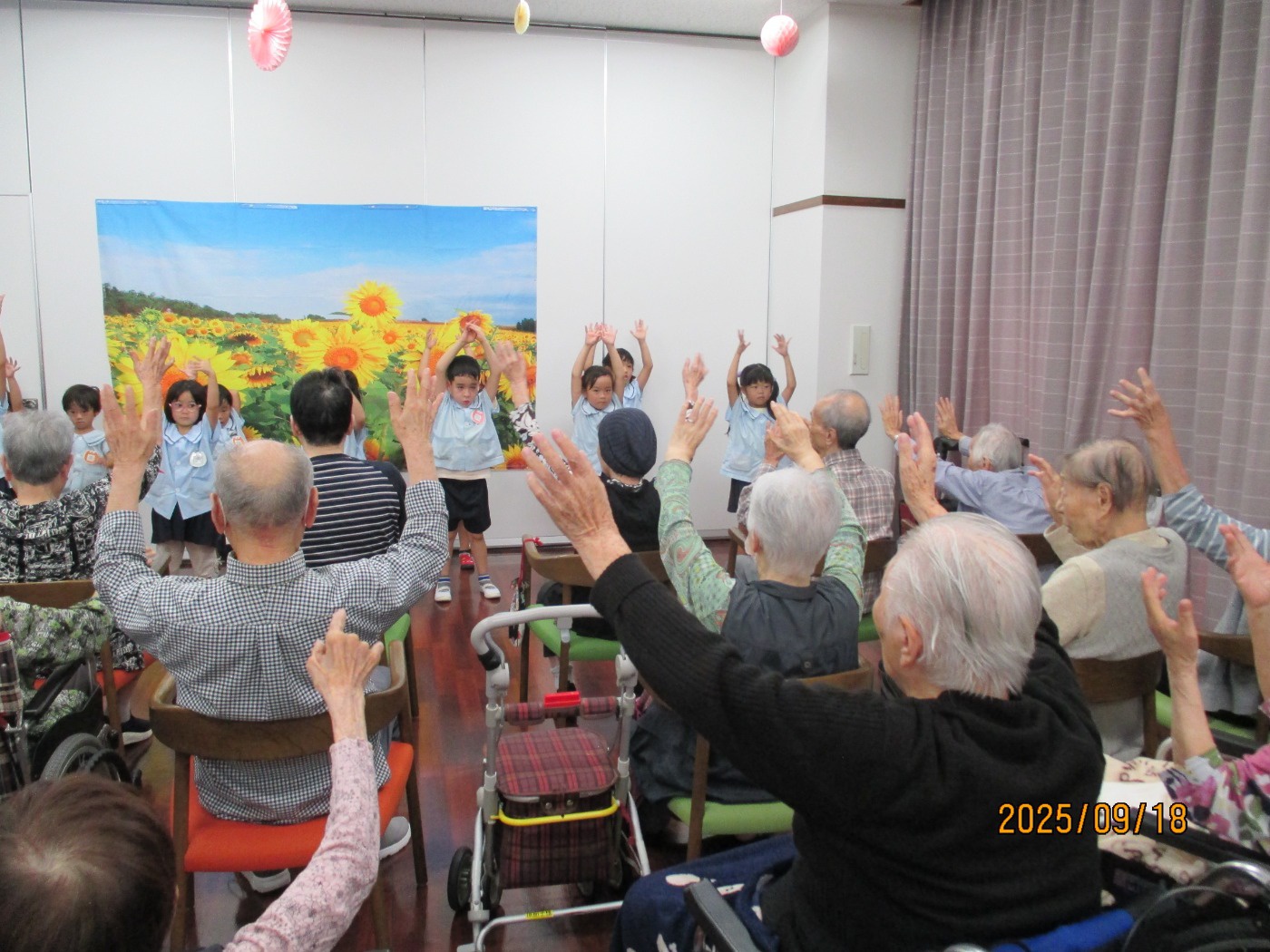 園児のみなさんの『高校三年生♪』の歌と体操を見て身体を動かしたり、手遊びのクイズに答えていました。「子供を見ていると若返ります。かわいい子供たちだねえ」とみなさん終始笑顔でした。