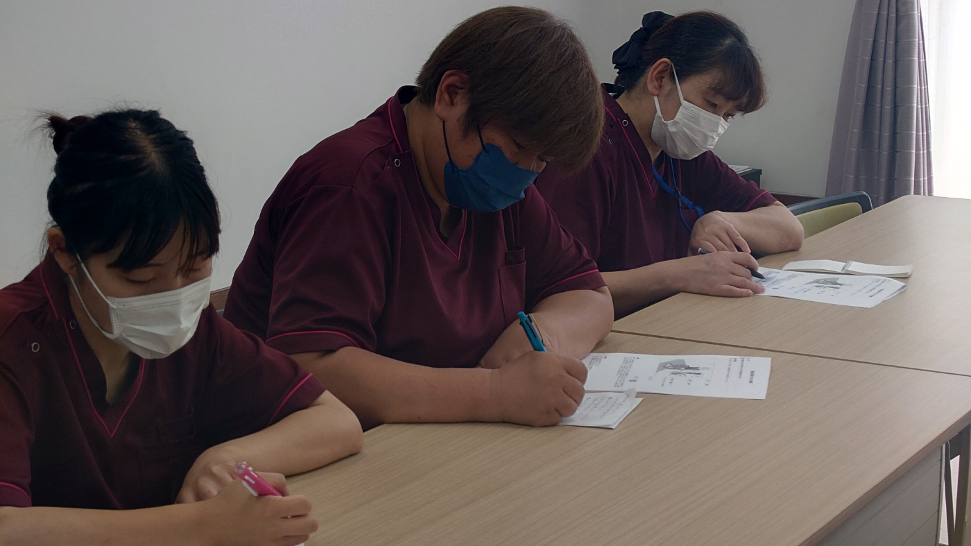 車椅子移動介助は簡単そうで、実は知識が少ないと非常に危なく怪我をしてしまう恐れもあるので、木場清里苑では定期的に職員へ指導を行っています。