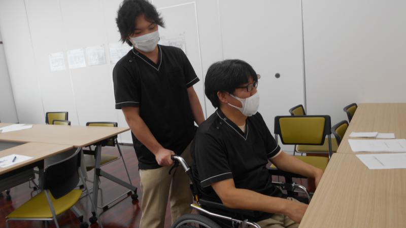 車椅子移動介助時にはたくさんの危険が潜んでいる為、まずは悪い見本を見てもらい勉強会参加者にどこに危険が潜んでいるか考えてもらいました!