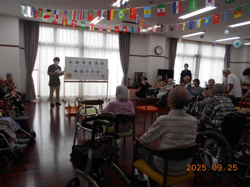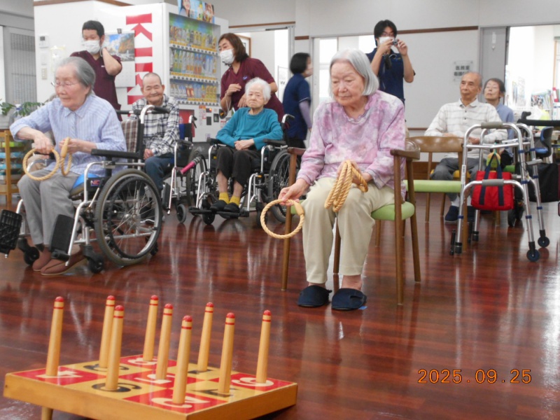 輪投げ大会が4階リビングにて行われました。最初は輪が的まで届いていない方が多く、何投か投げているうちに「入った!7点だ!」と喜ぶ方もいて楽しまれていました。