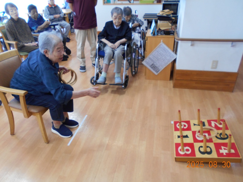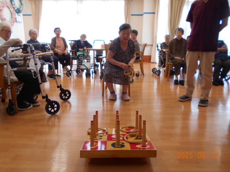 毎年恒例の輪投げ大会が5階リビングにて開催しました。「こう持つの?」と確認しながら急いで投げている方もいたり、狙いすぎて失敗されると悔しがっている方もいました。