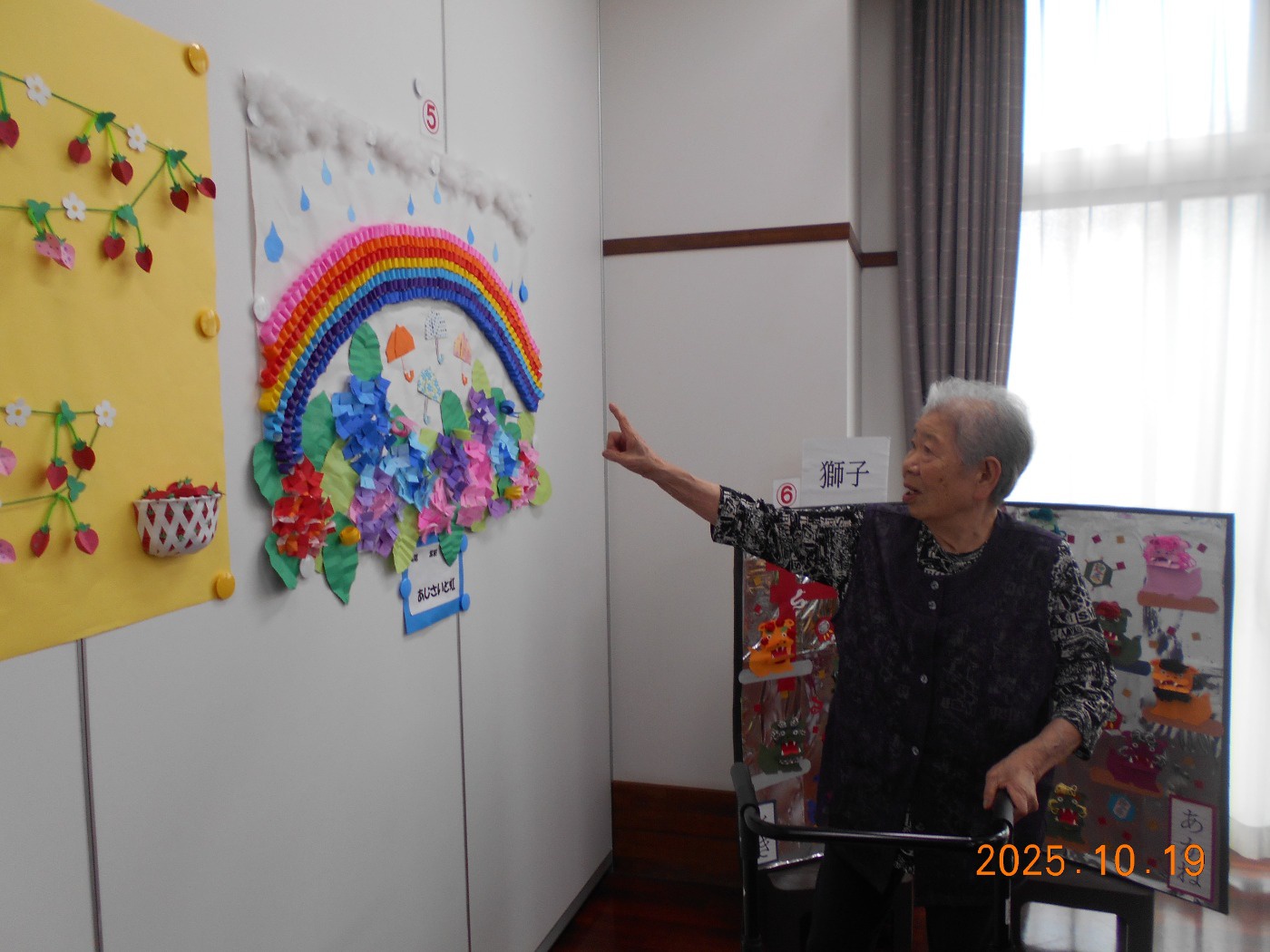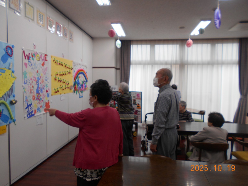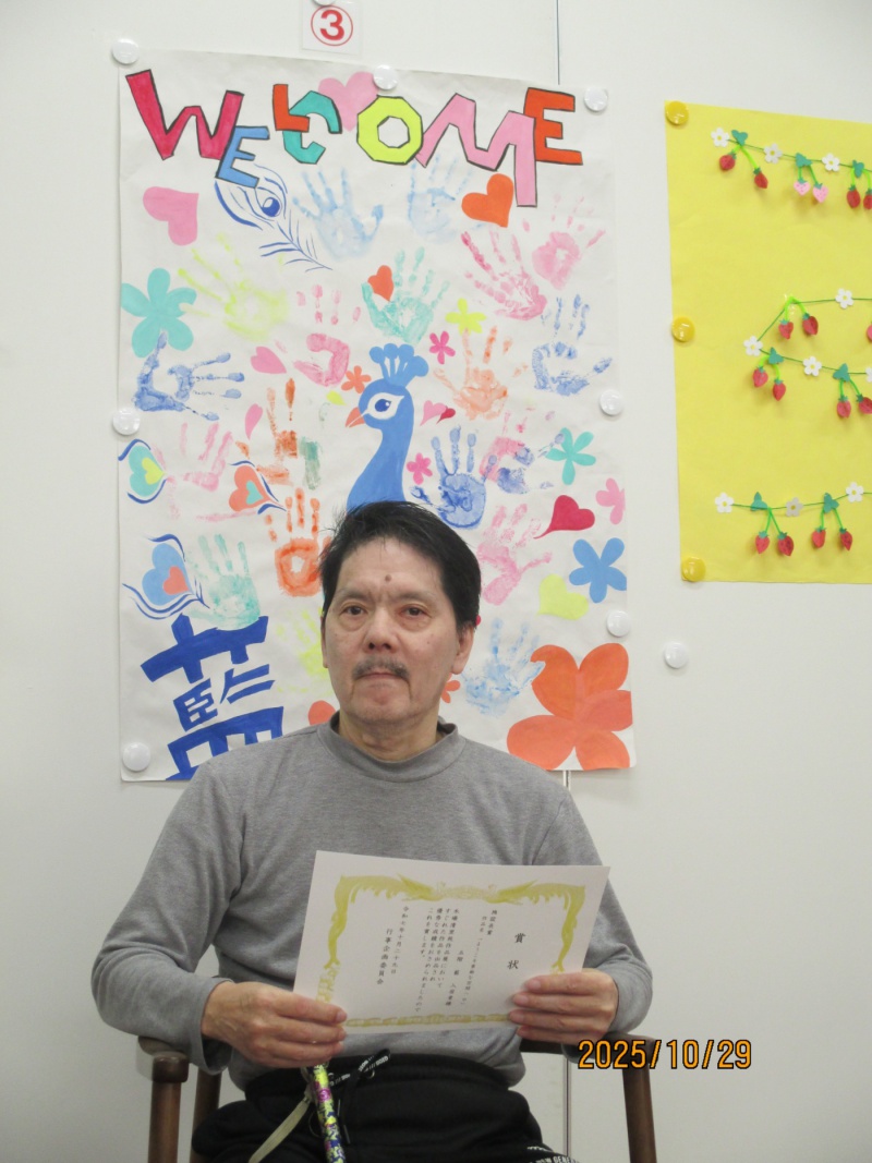 展示した「ようこそ素敵な空間へ」が施設長賞を受賞しました。「よかったですね」と声かけすると笑って喜んでいました。