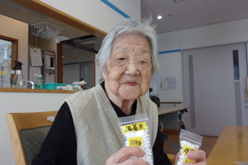 今年の流行った備蓄米もビニール袋に丸い発泡スチロールを入れる形で制作しました。「ここに入れればいいの?小さいね」と話しながら制作していました。