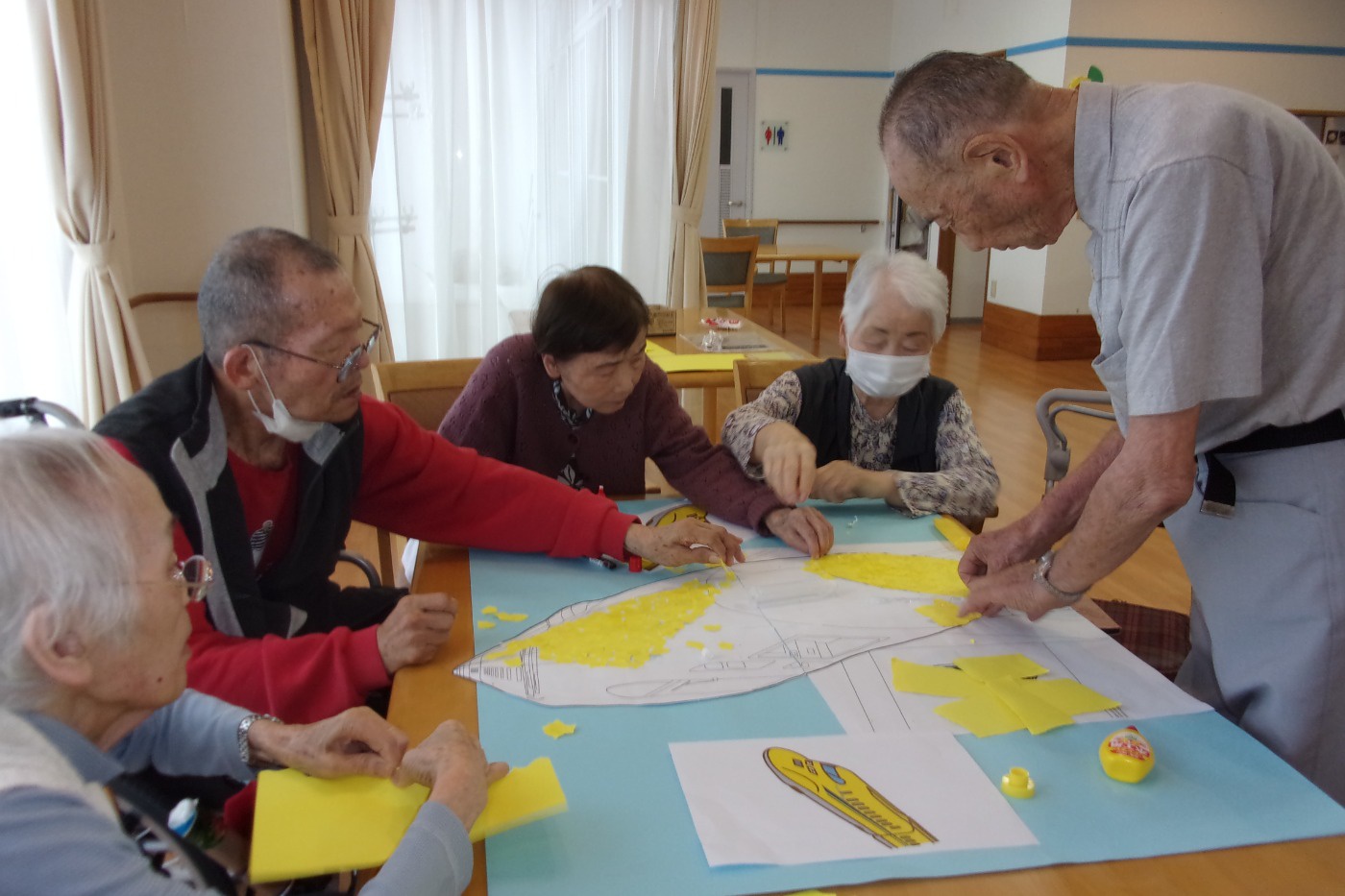 ドクターイエローを制作しました。色画用紙をちぎって台紙の上に張り付ける貼り絵の形で作りました。みなさん「ここはこの色?この狭いところに貼るの?」と聞きながら笑顔で制作していました。