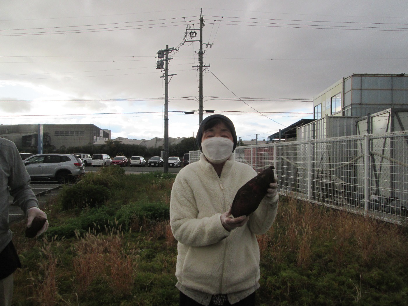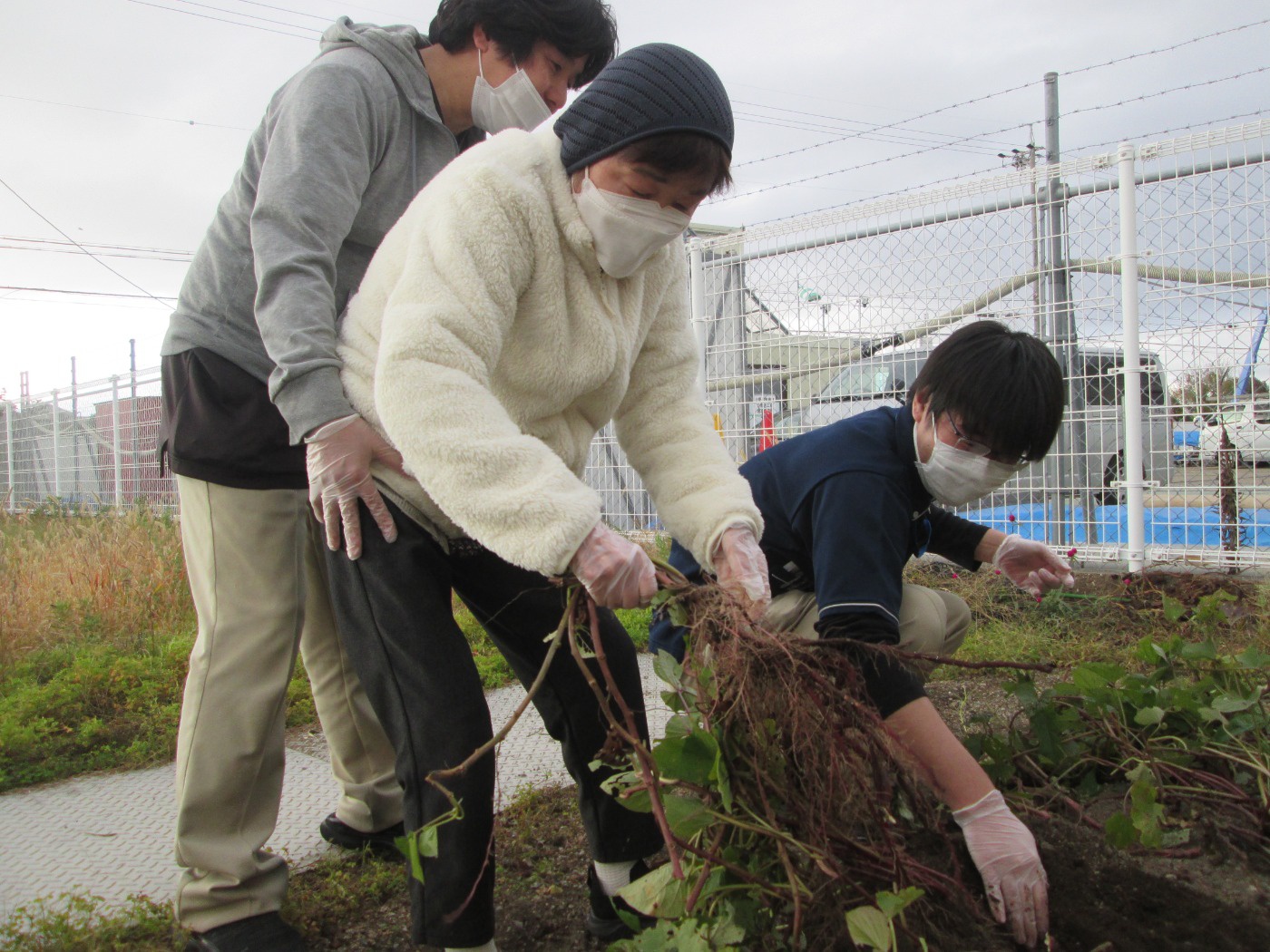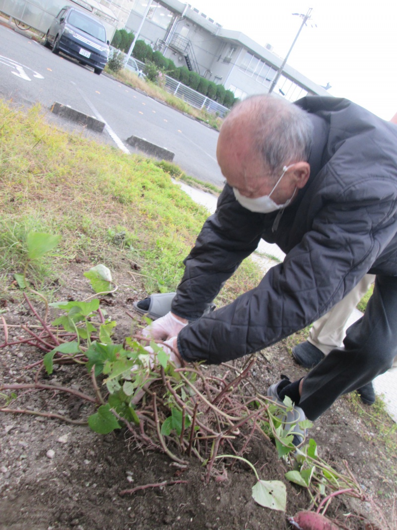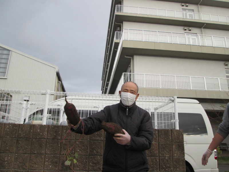 この日は少し風もあり寒かったが、頑張って土を掘り大きなサツマイモが出てくると「見て、すごく大きいよ」と話され喜んでいました。大きい芋が掘れて満足されていました。