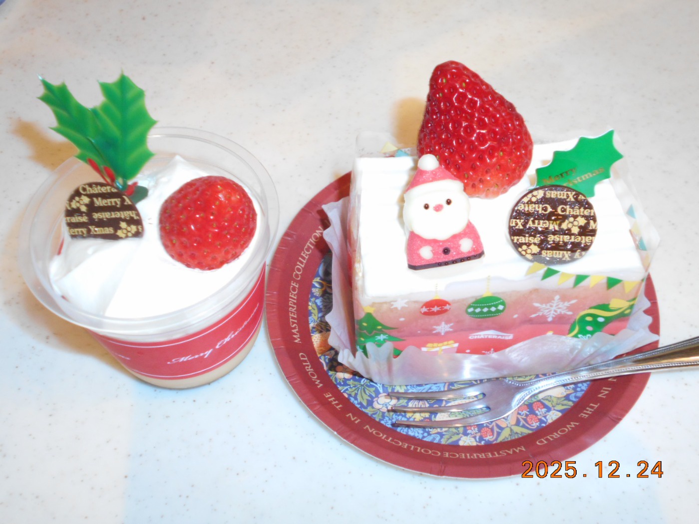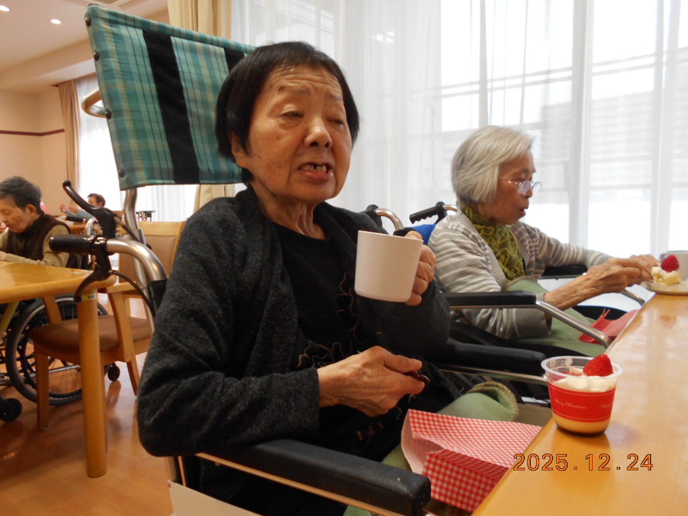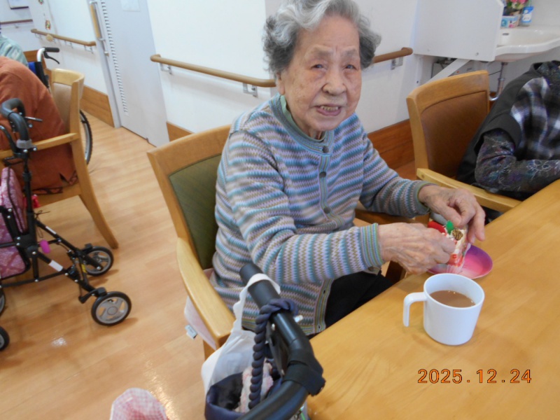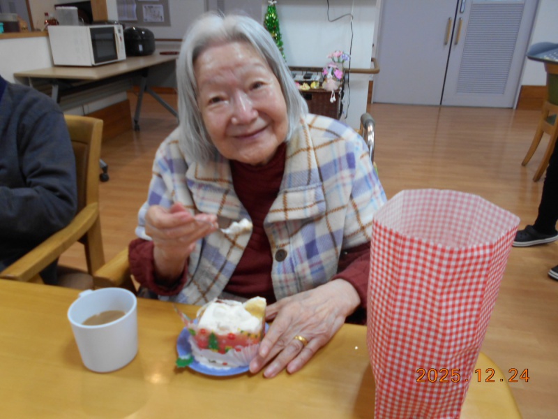 おやつ時に、クリスマスケーキやプリンを召し上がりました。