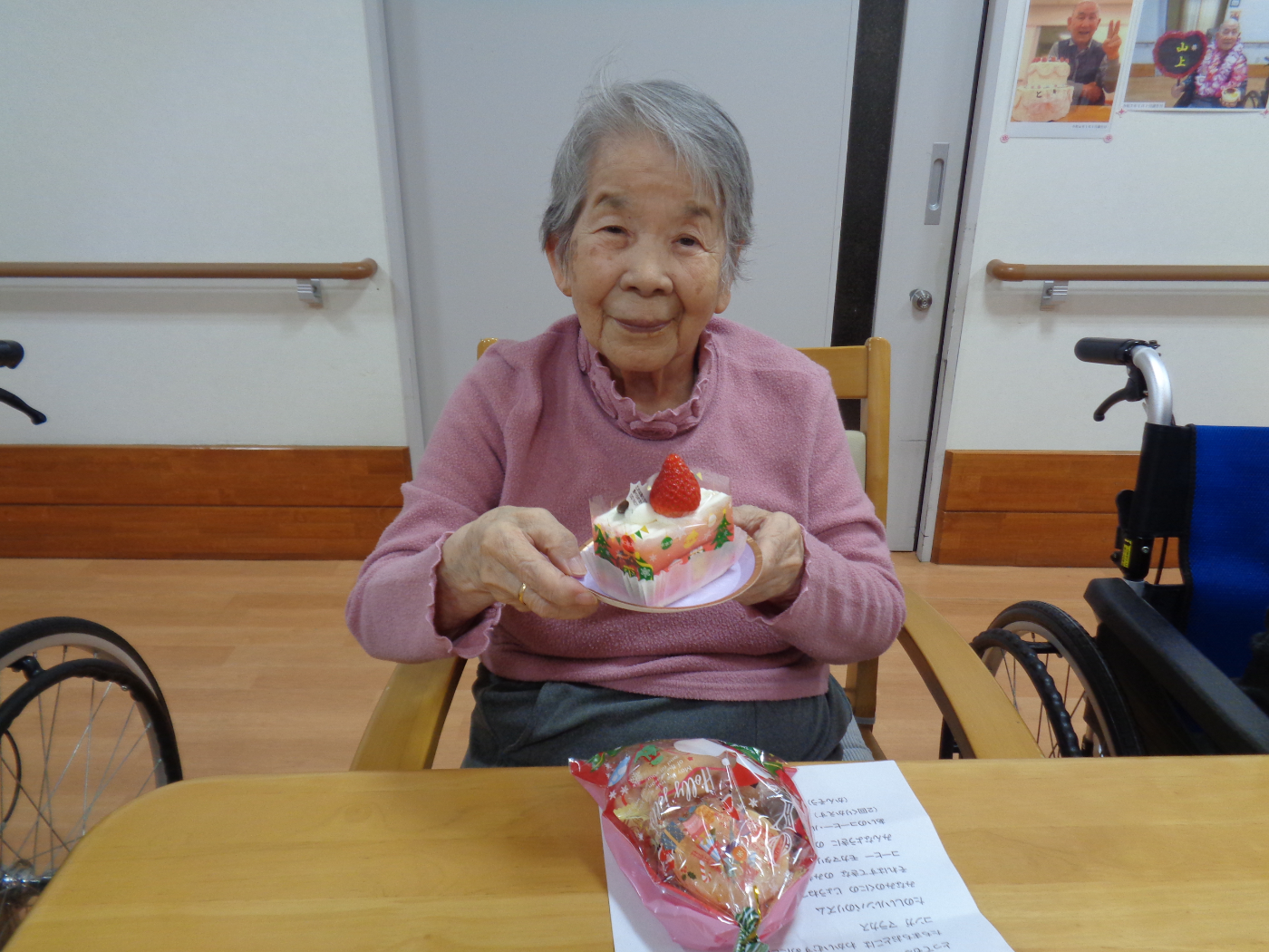 クリスマスプレゼントとして、ケーキとお菓子を みんなさん美味しそうに食べられていました。 「もう1個欲しい」と言われる入居者も見られました。 「大満足だわ」「とても楽しかった」とみんな喜んで もらえてとてもよかったです。