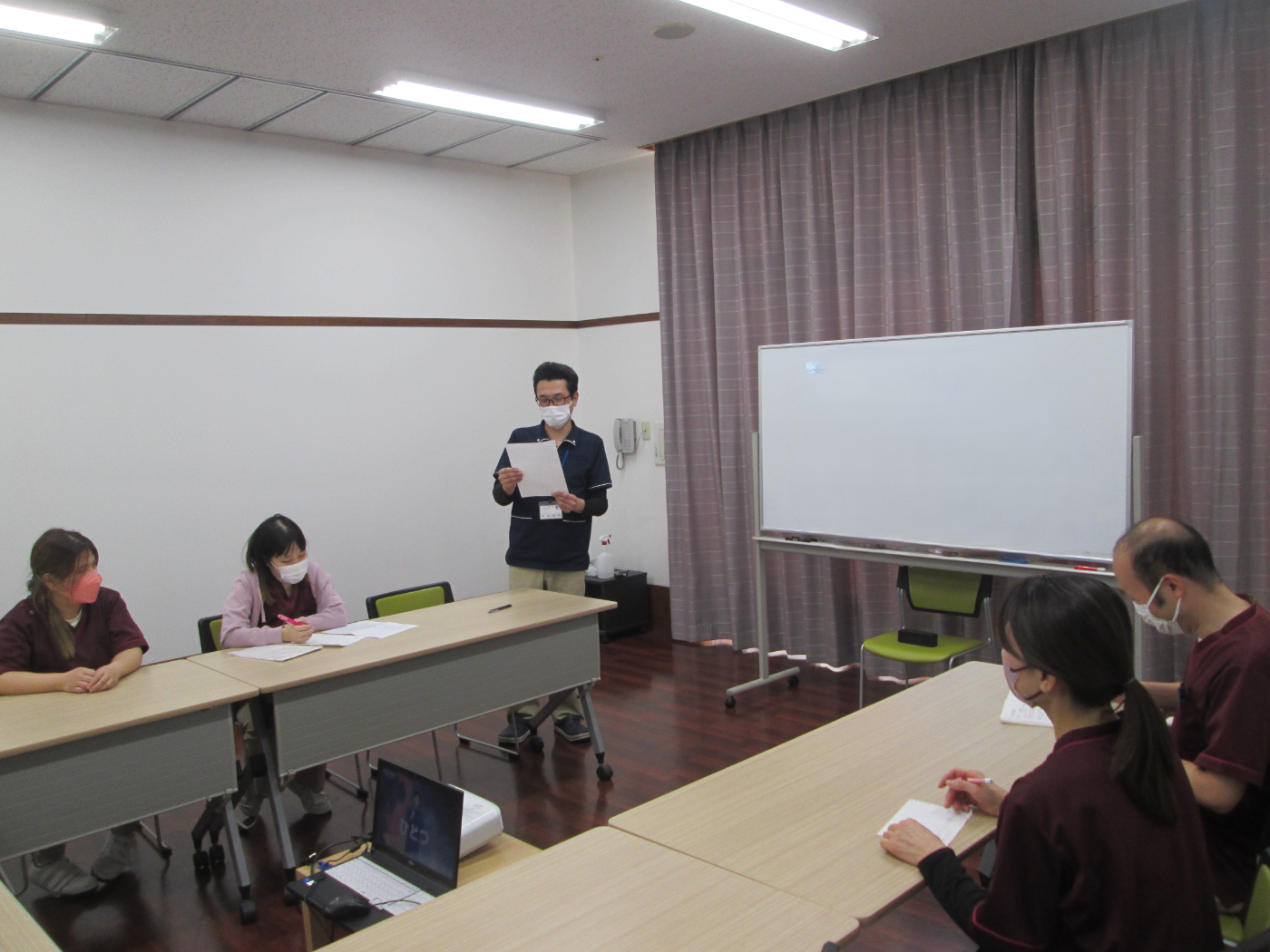 夜間を想定とした防災訓練を実施しました。 職員が少ない時間帯でどのように避難誘導すればいいのか意見交換を行いました。 迅速かつ無駄な行動を減らしていくかが重要な課題でした。 また、入居者様がパニックにならないような声かけも学ぶ場となりました。