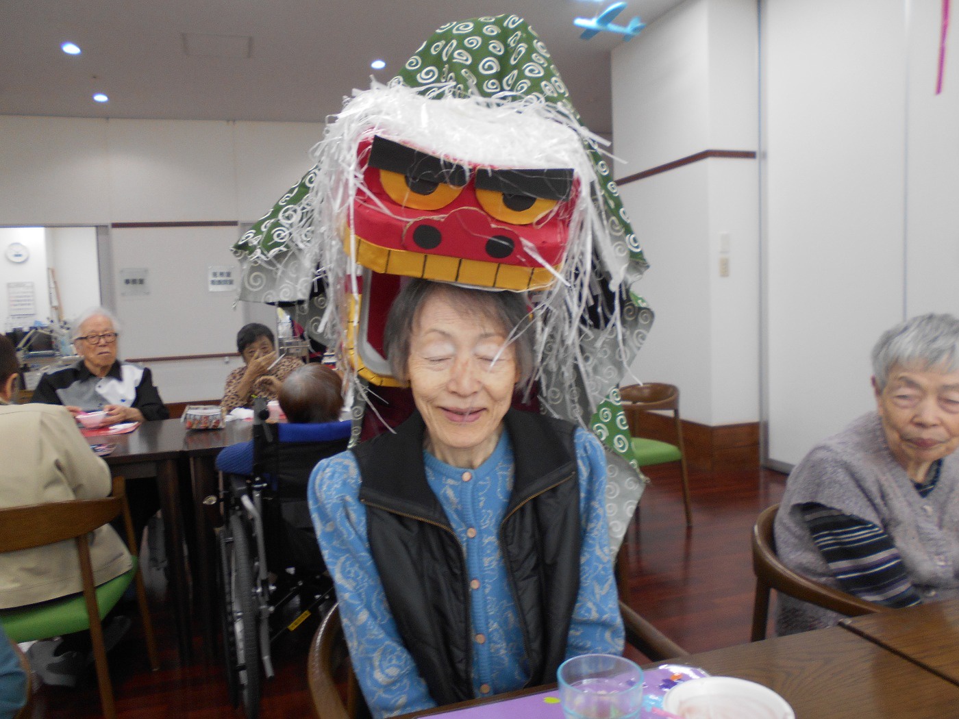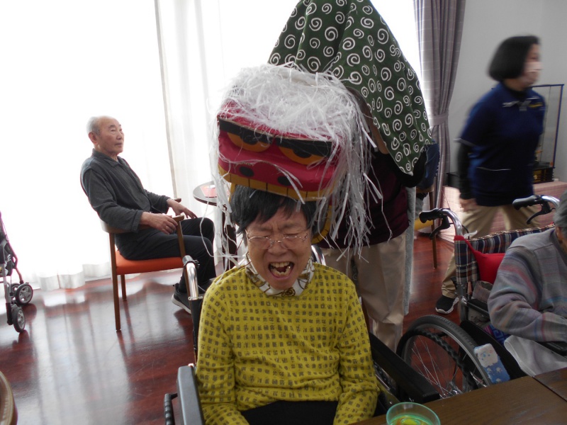 獅子舞が入居者様の頭の辺りをかぷっとするとほとんどの方が笑っている印象でした。