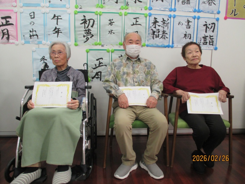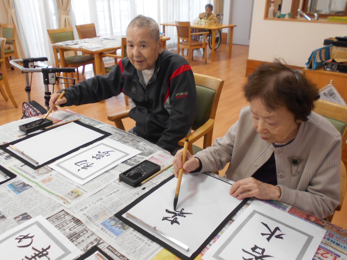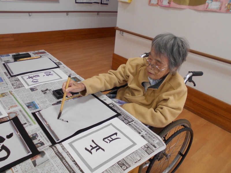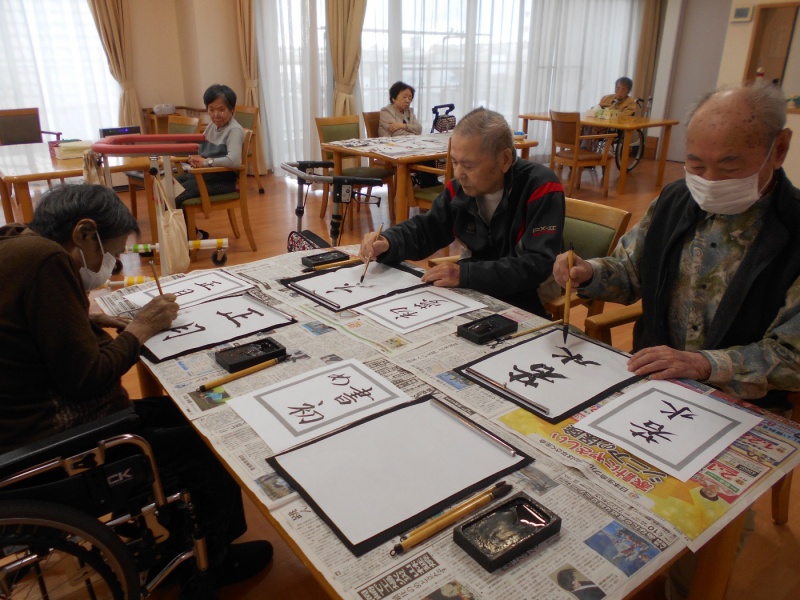 また、「私早く書きたい。先に書きたい」と積極的に参加されたり、「なんか上手くいかん」と「初夢」と書き途中で止めていた方がいたので、「正月はどうですか?」と勧めると綺麗にかけて喜んでいました。