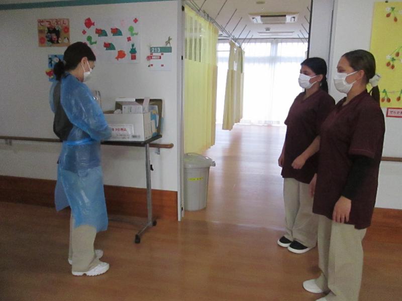 本日は感染症対策委員会による感染対策の勉強会を行いました。 今回のテーマは高齢者に起こりうる感染症対策を行いました。 実習としては、居室対応を行う際の対応手順をやってもらいました。 この勉強会を通して、みんなに感染対策を覚えてもらい蔓延させないようにしていきたいです