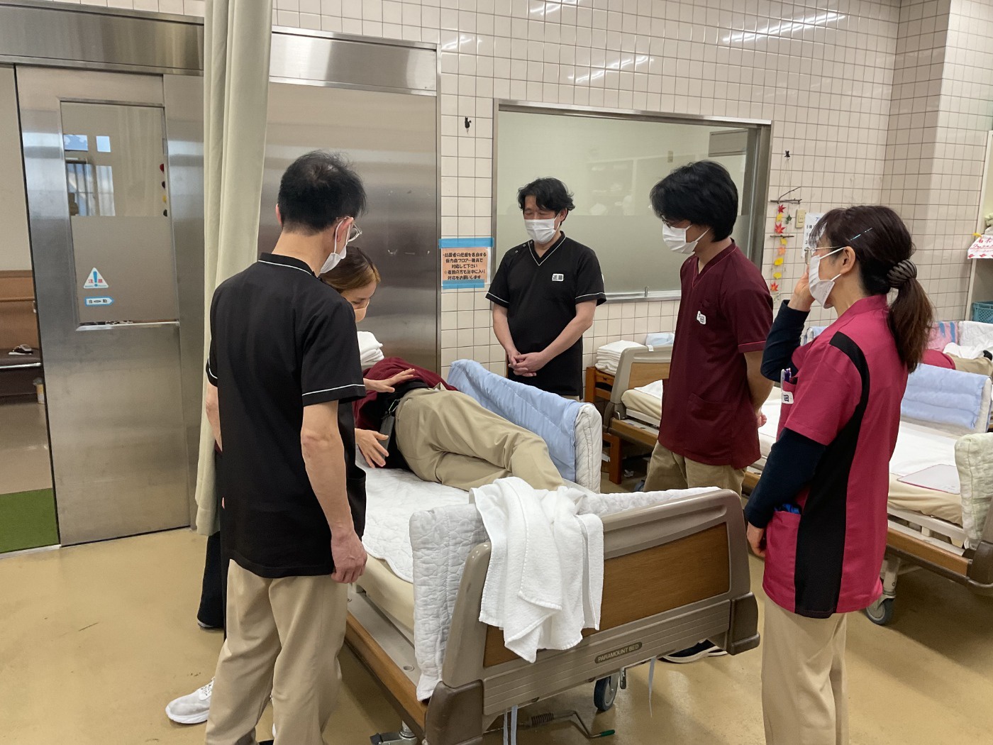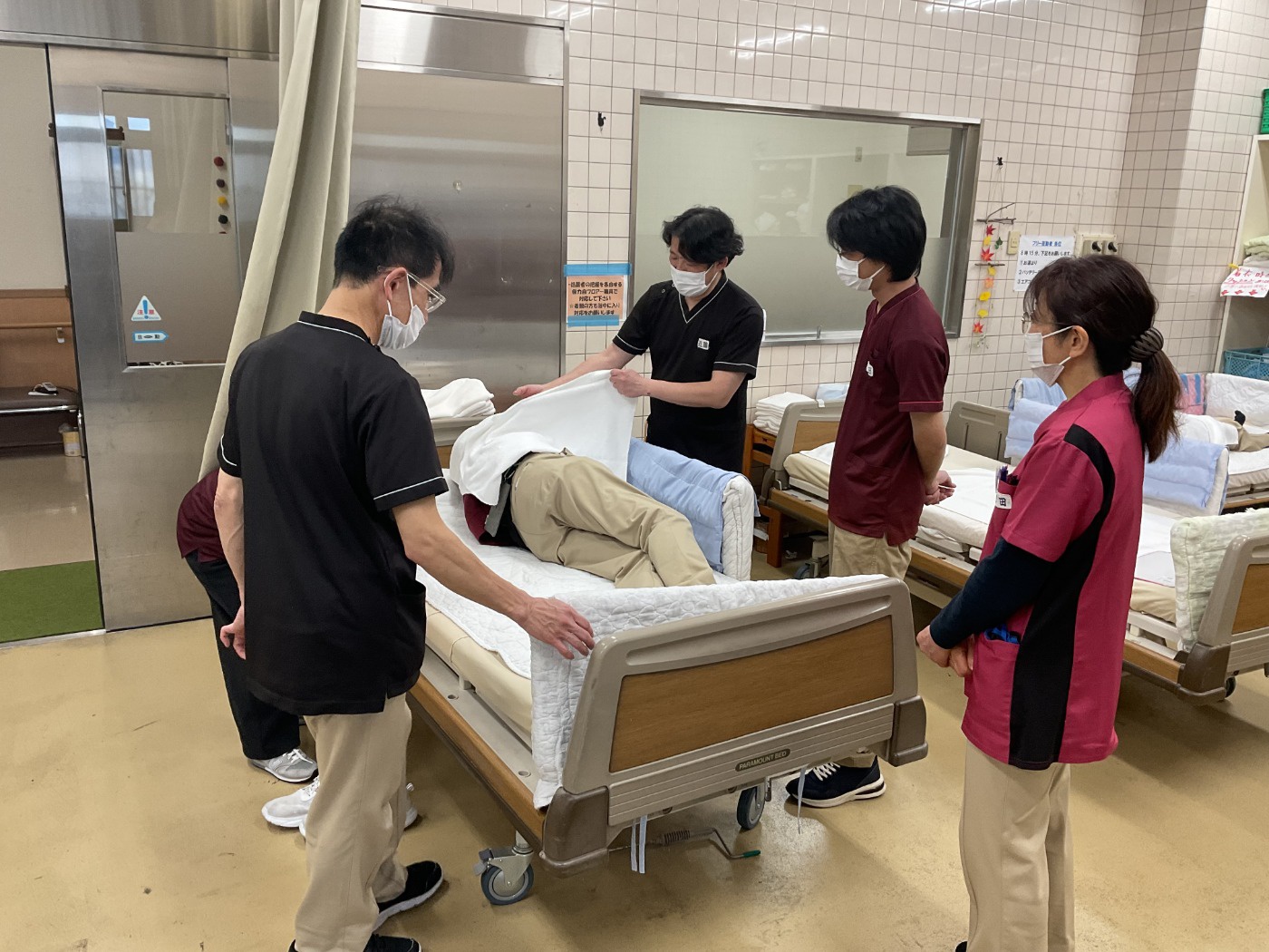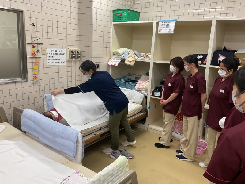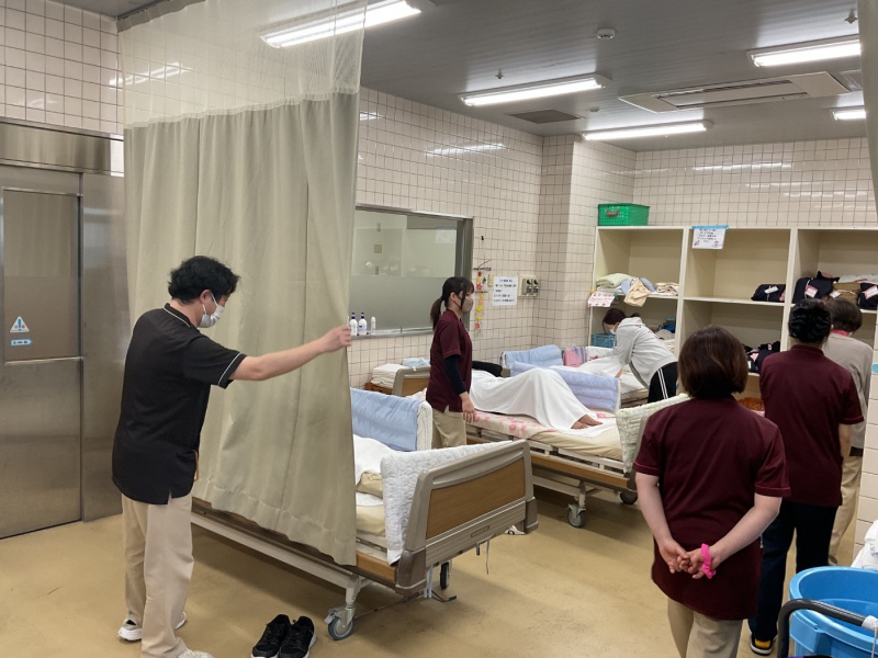 入浴中は複数の職員が洗い場や脱衣所を行き来しています。その様な状況で体に何も掛けず、裸の状態で横になっていることを想定し、職員が数名周りを取り囲んでいる時、ベッド周りに誰もいない時の2パターンを交代で体験してもらいました。