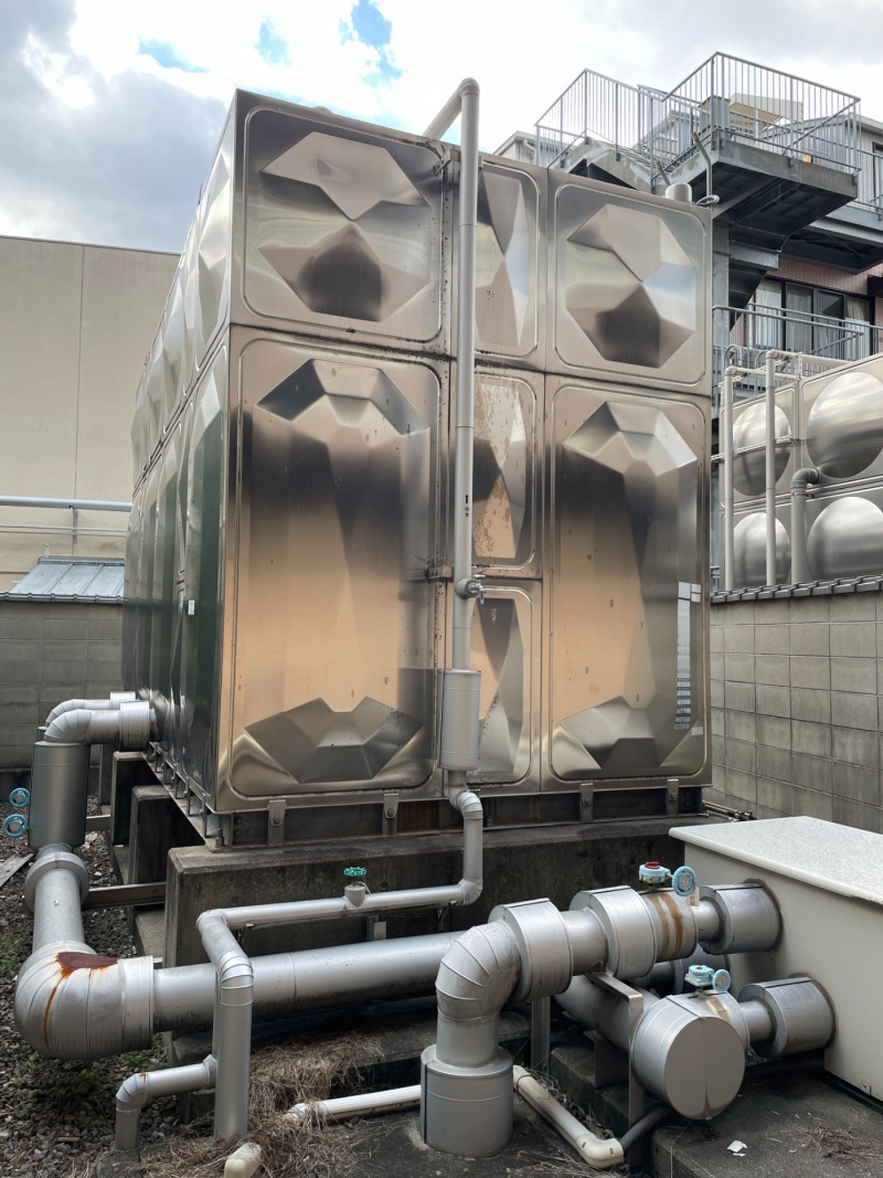 中庭の隅に受水槽がありますが、災害時には1日目は飲料水として使用、2日目以降はトイレ掃除や、洗い物、体を清潔にするなど生活用水として使用します。