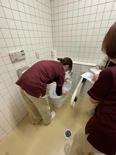 施設長のレクチャーを受けてから、実際のトイレでも実践してみました。作業としてはとても簡単で、道具さえあれば誰にでも簡単にできることが分かりました。