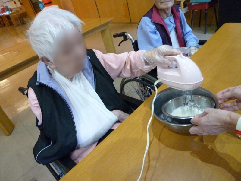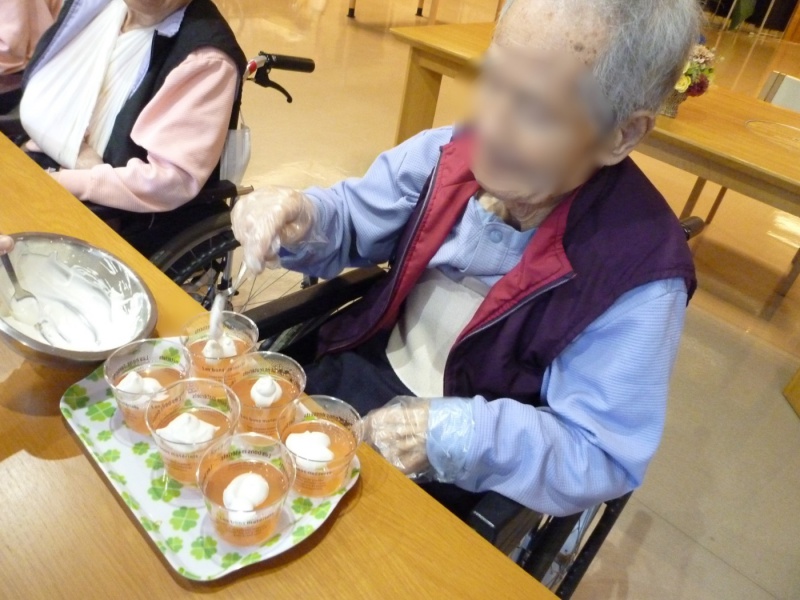 ゼリーは固めるのに時間がかかるので、あらかじめこちらでご用意し、トッピング用の生クリームを泡立てていただきました。ハンドミキサーが重たいのに「大丈夫よ」と片手で頑張ってくださっていました。