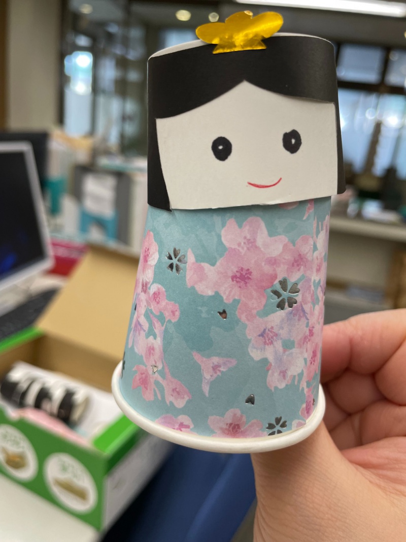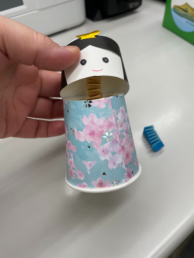 今月の2F美術クラブでは、ひな祭りに合わせてお雛様を作りました。 折り紙で作ったバネを首の部分に接着したので、首がゆらゆらと揺れて何とも愛嬌のある可愛いお雛様が出来ました。