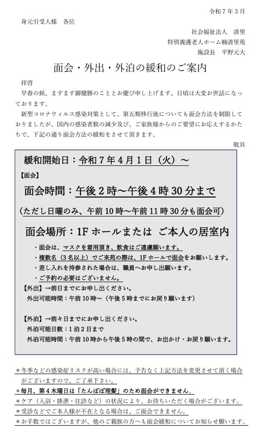 - 注意 : 第4木曜日は面会はありません(理髪の日のため)