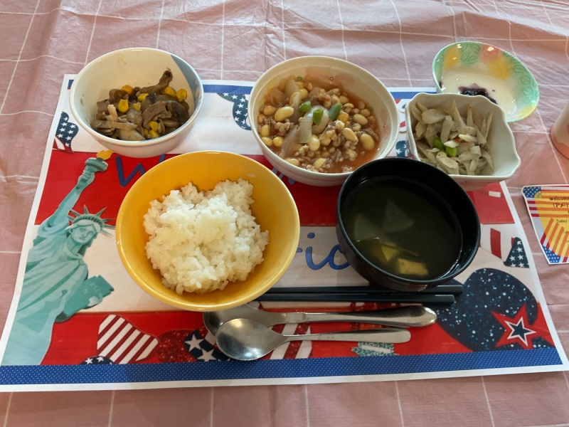 メニューは、ポークビーンズ、きのこソテー、ごぼうサラダ、ご飯、コンソメスープ、フルーツヨーグルトでした。