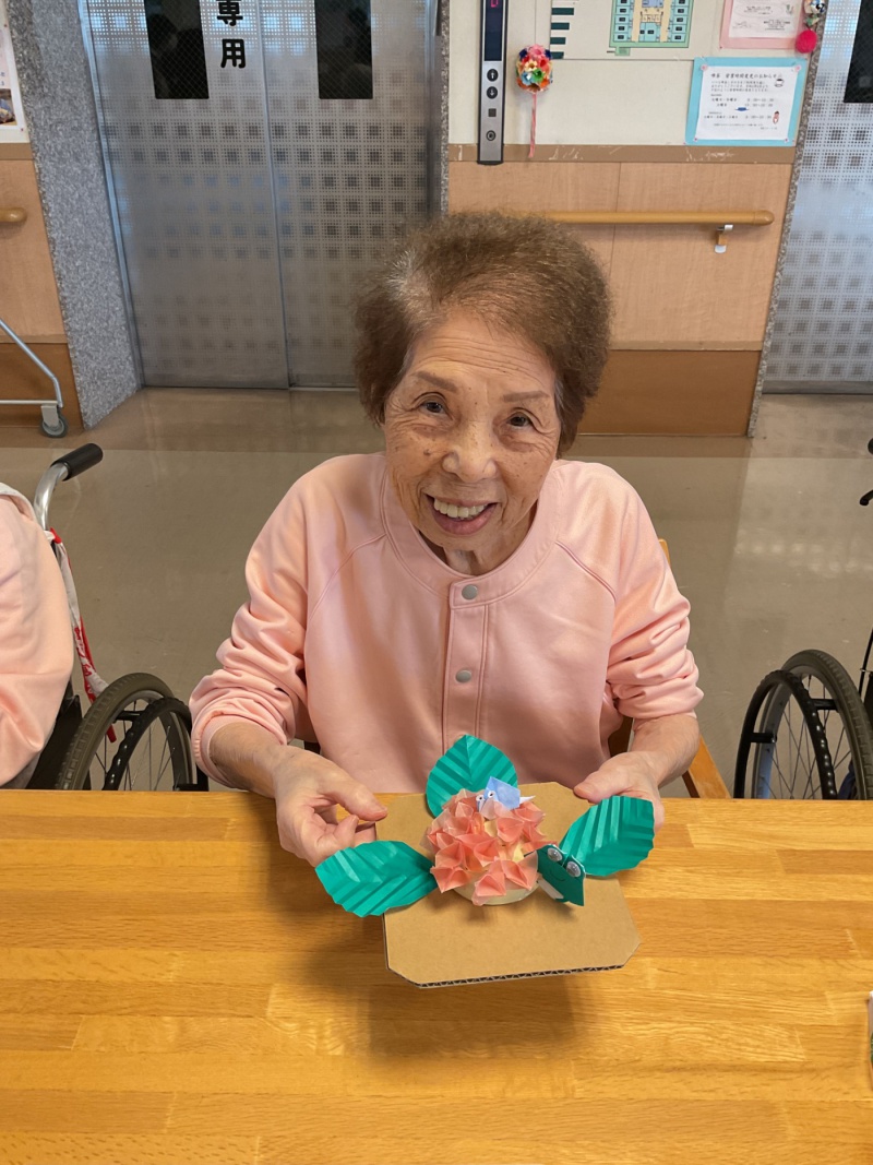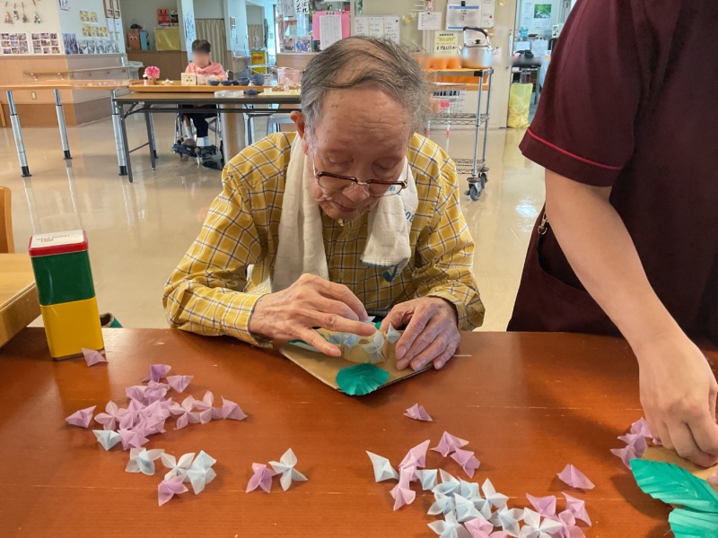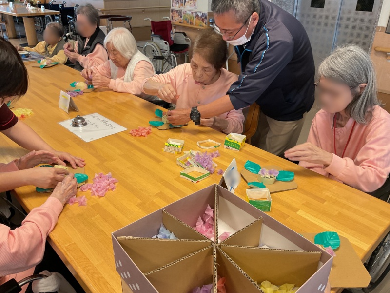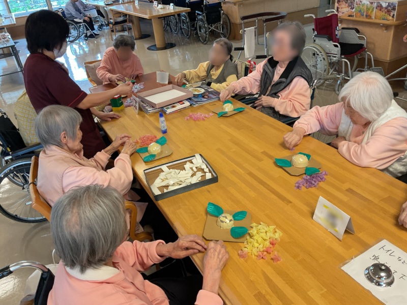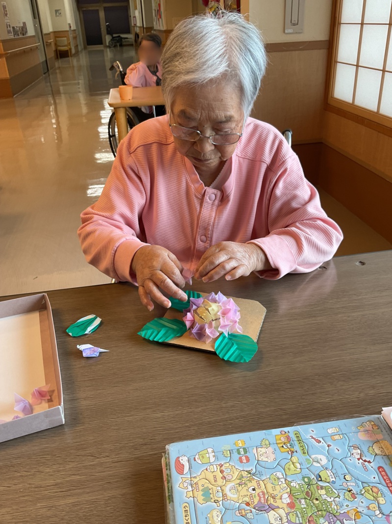 2F美術クラブでは紫陽花のお花を作りました。職員が土台を準備してくれているので貼りつけていきます。