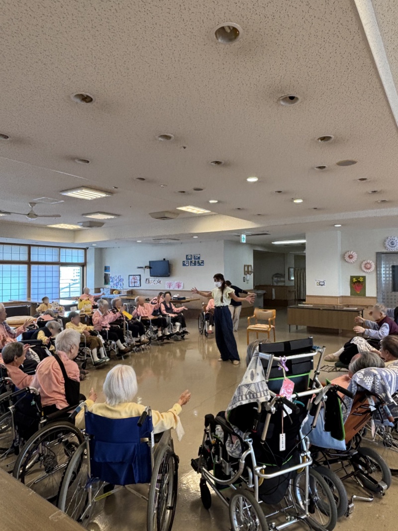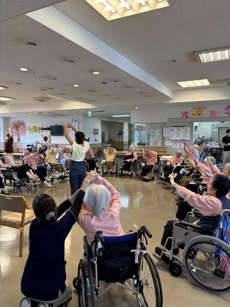 先日は先生にお越しいただき、はぴヨガ体操を行いました。腕や足を動かす時に呼吸や発声も意識していくのですが、終わるころにはスッキリしています。皆さん、この時間を楽しみにして下さっていますよ。