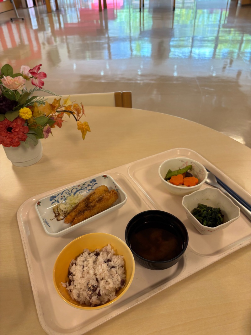 通常メニューは、~エビフライ、高野豆腐の煮物、ほうれん草のお浸し、赤飯風小豆ご飯、味噌汁~でした。