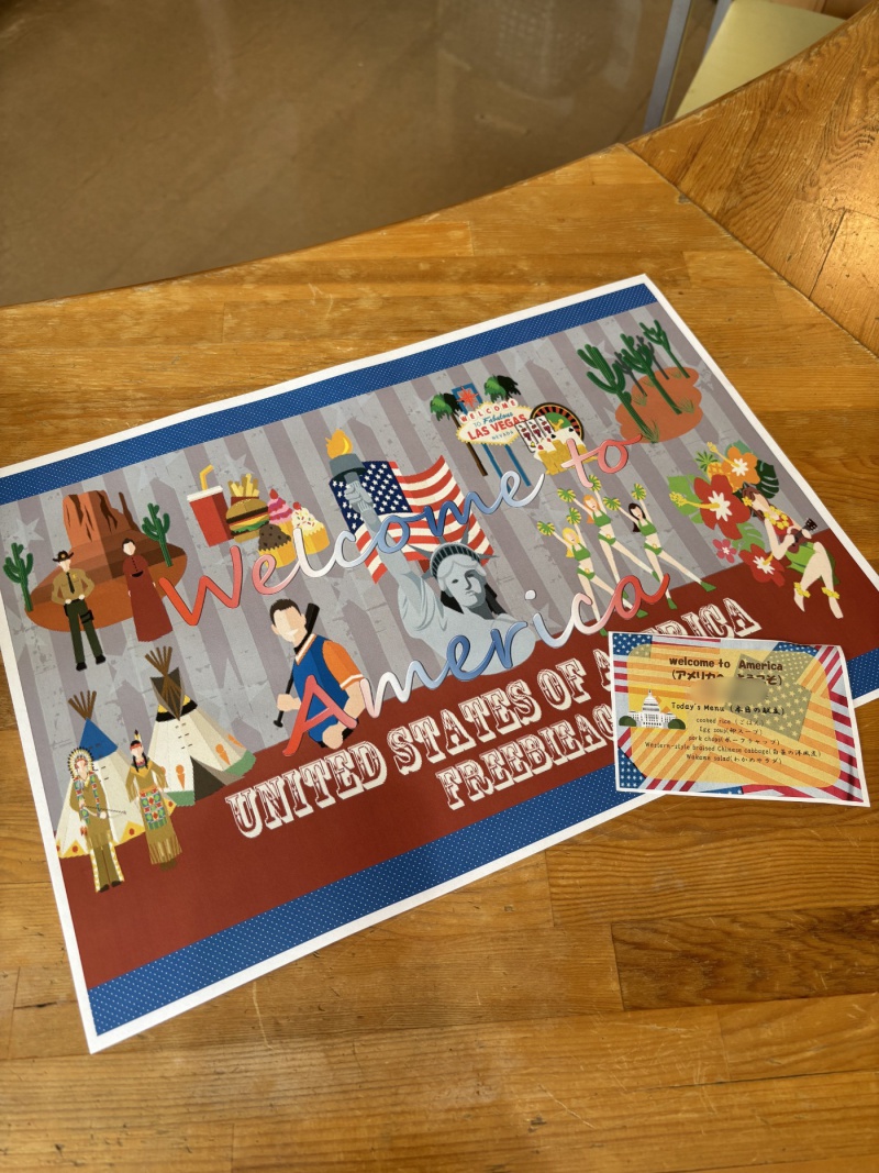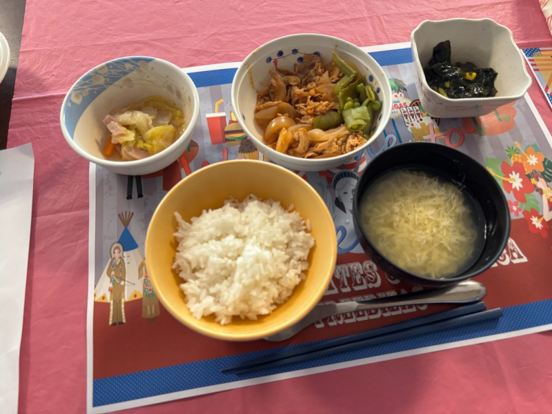昼食のメニューは、ポークチャップ、白菜の洋風煮、わかめのサラダ、卵スープでした。ランチョンシートと座席表もご用意しております。