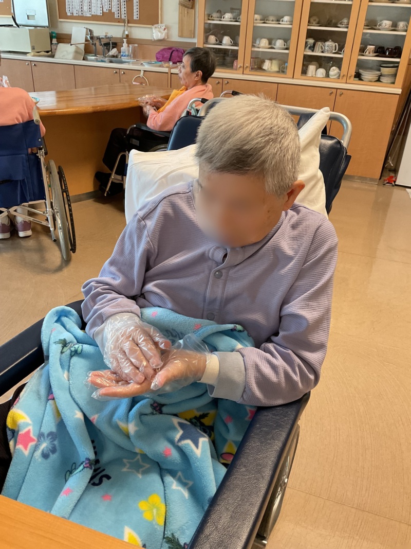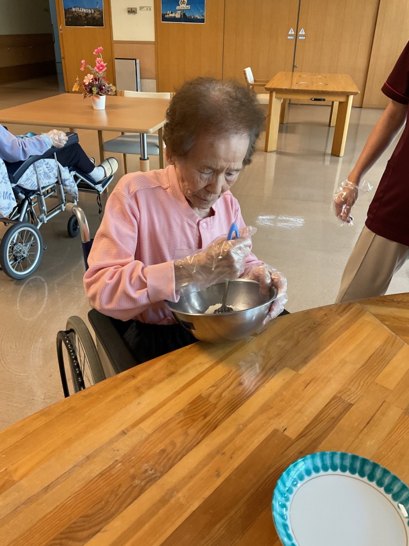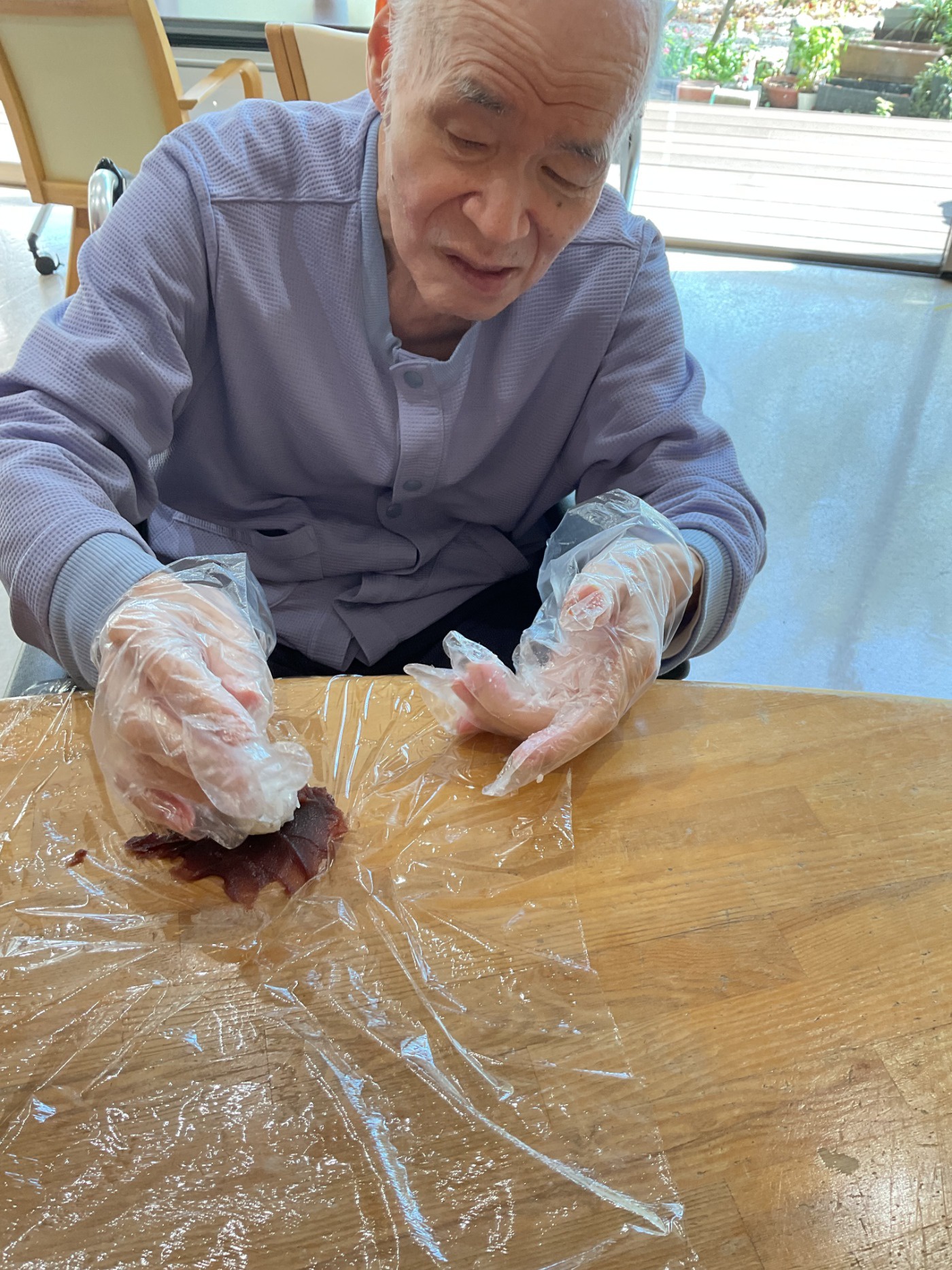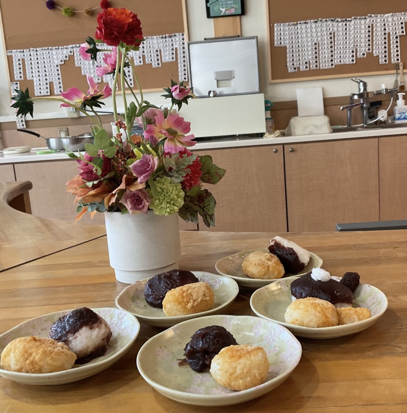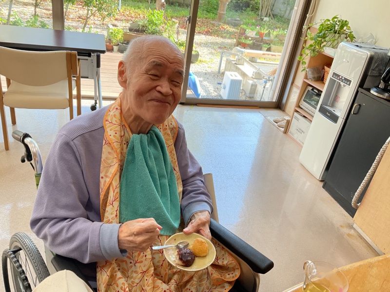 皆さんで協力した甲斐があり、美味しそうなおはぎができました。お味をお聞きすると、この笑顔!とても美味しく召し上がってくださいました。来月も楽しみになさってくださいね。