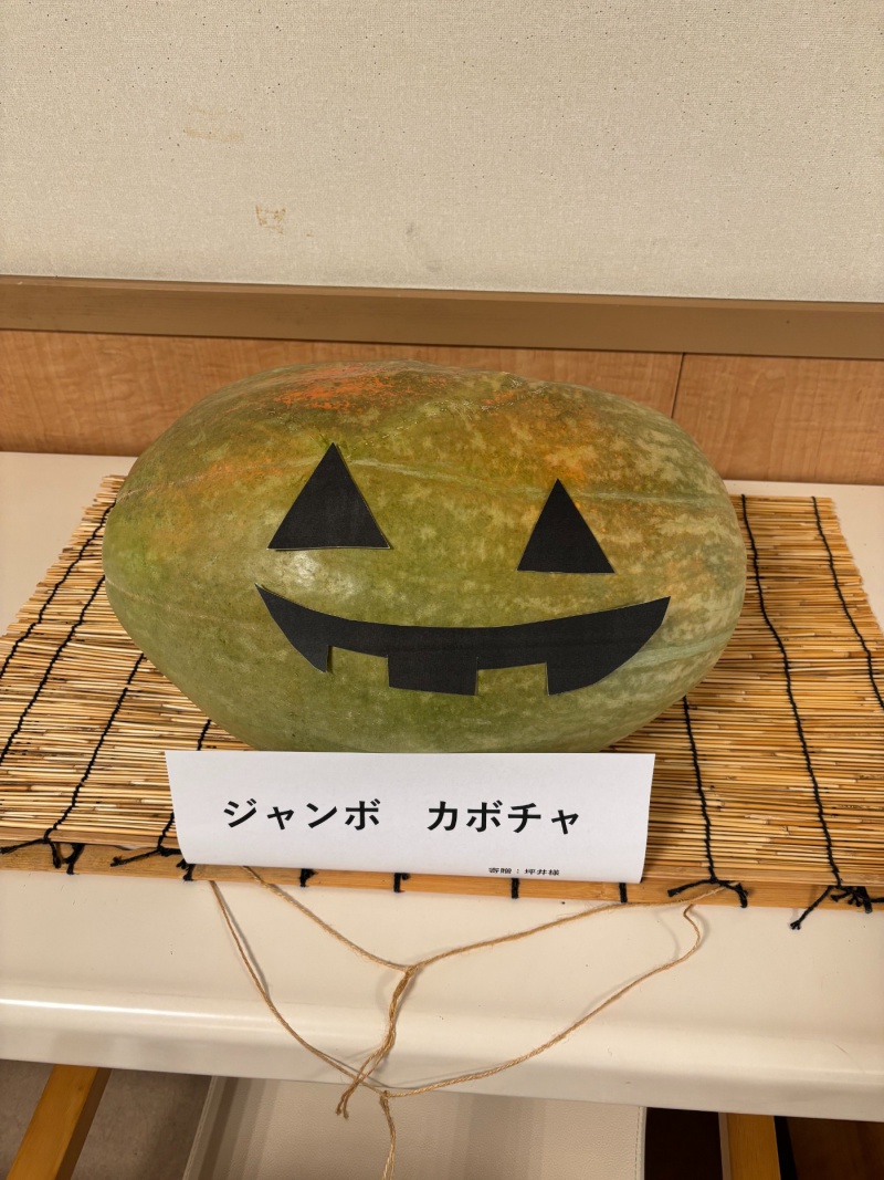 先日ご家族様からいただきましたジャンボカボチャに、ジャックオーランタンの顔を作りました。よりハロウィーンらしくなりましたか?