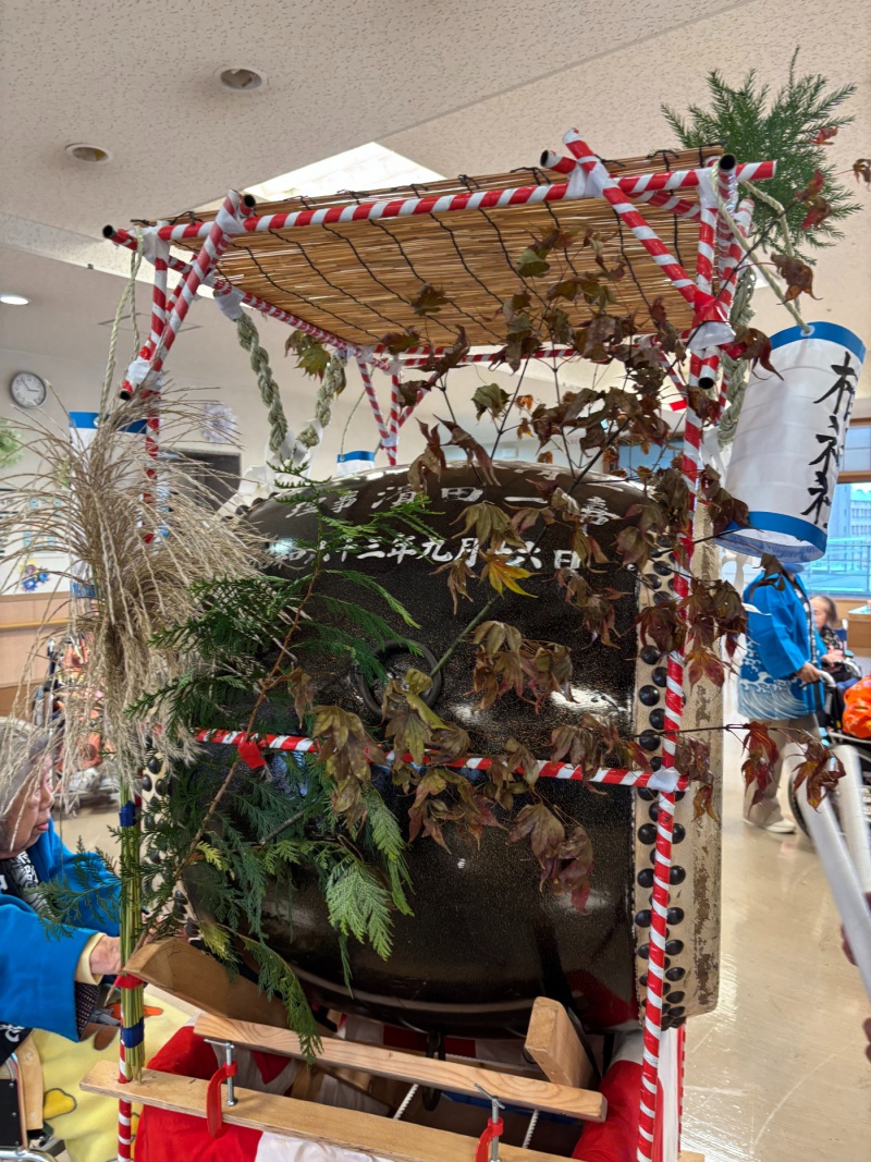 職員が飾りつけ用に紅葉やススキを持って来てくれたので、秋が感じられる素敵な太鼓になりました。