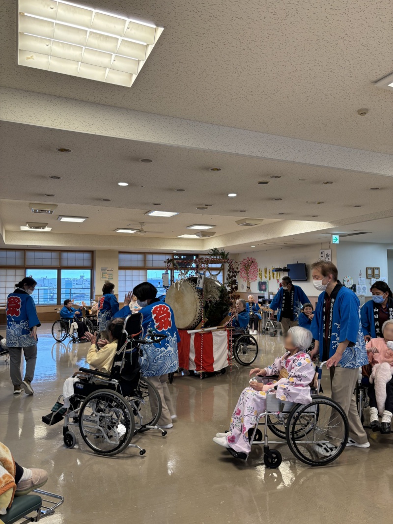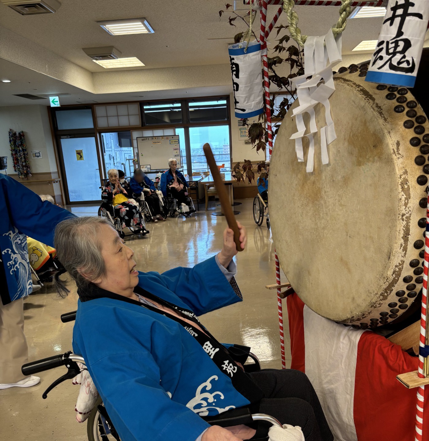 演奏中は、順番に太鼓を叩いていただきました。頑張って数曲叩いてくださった方もいらっしゃいましたよ。