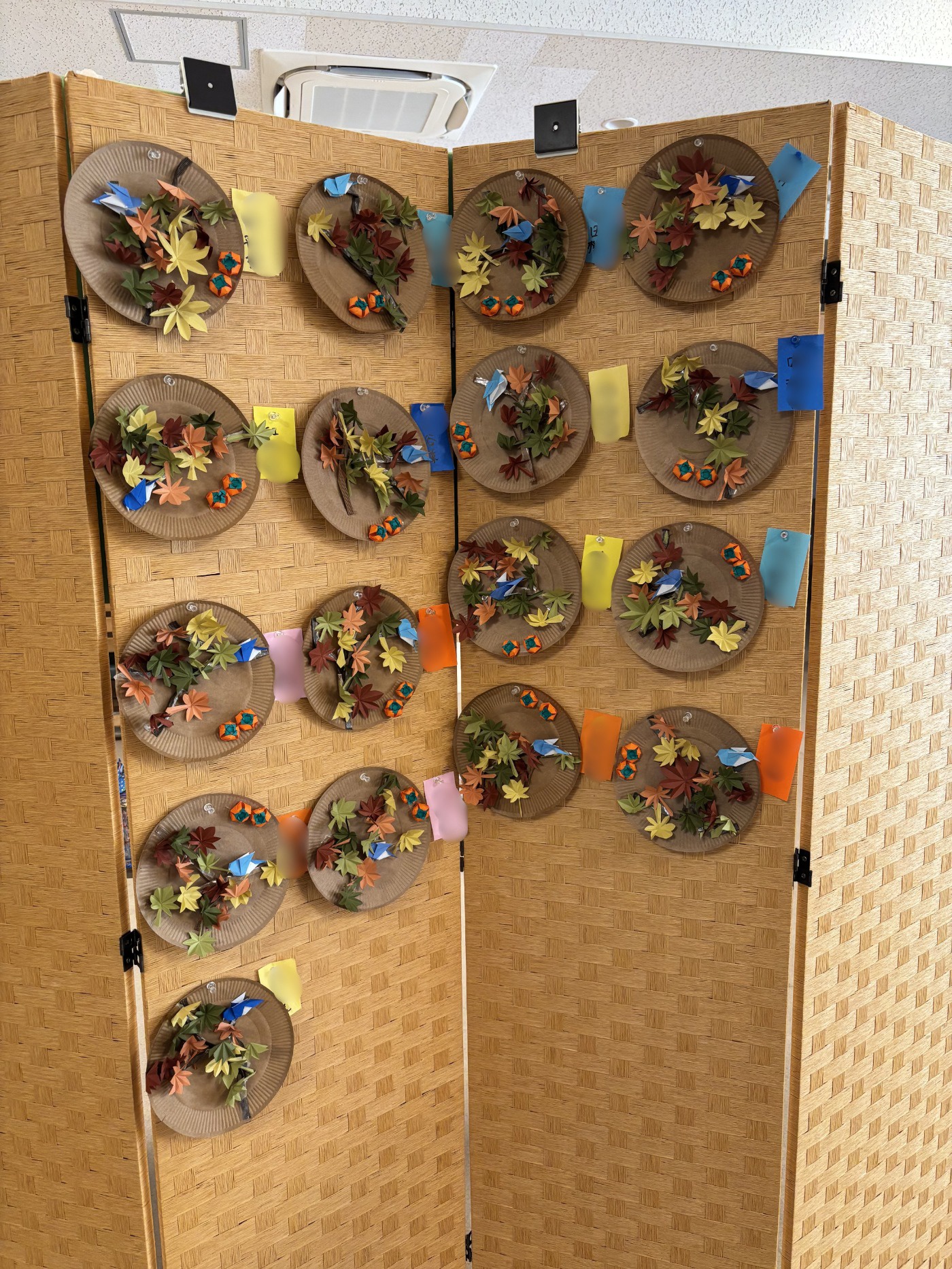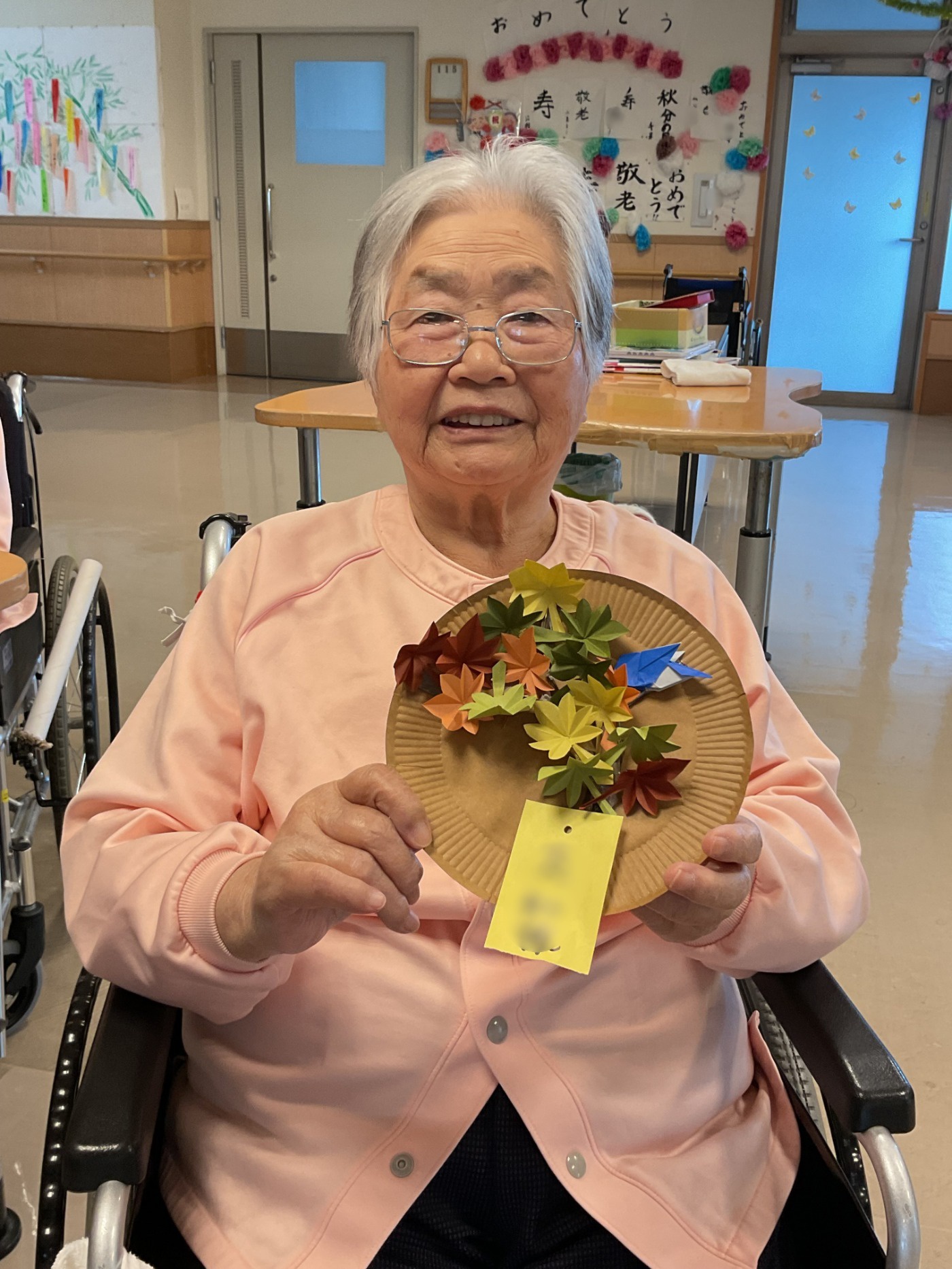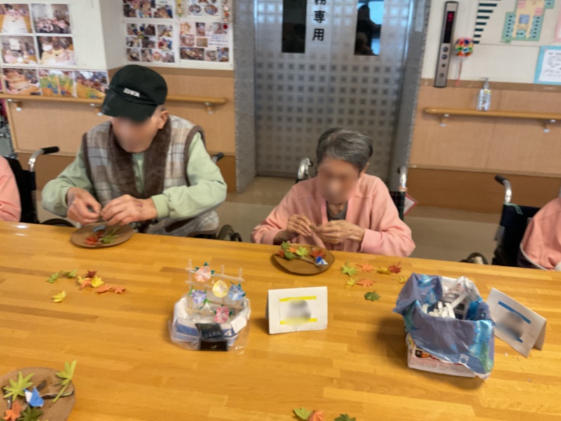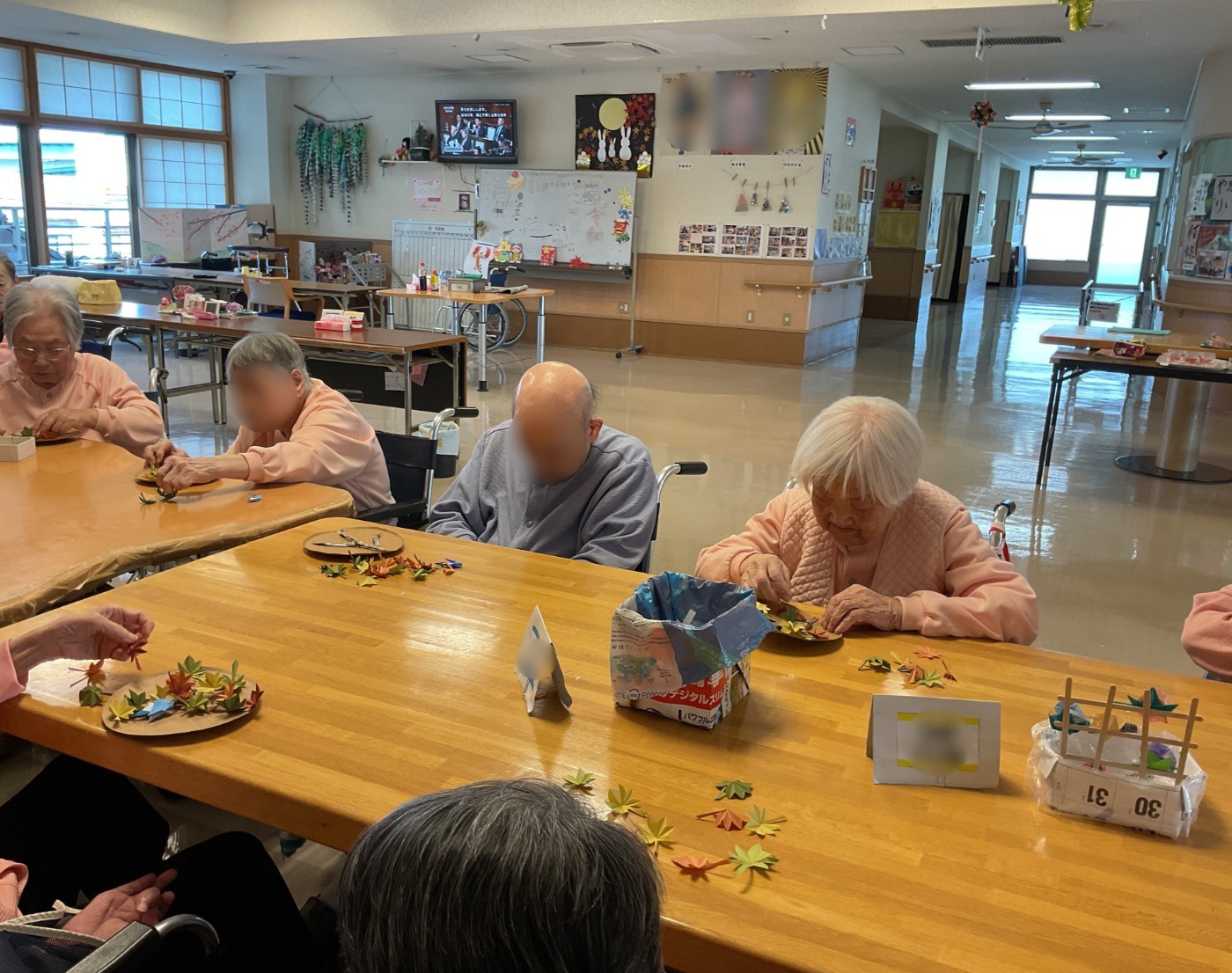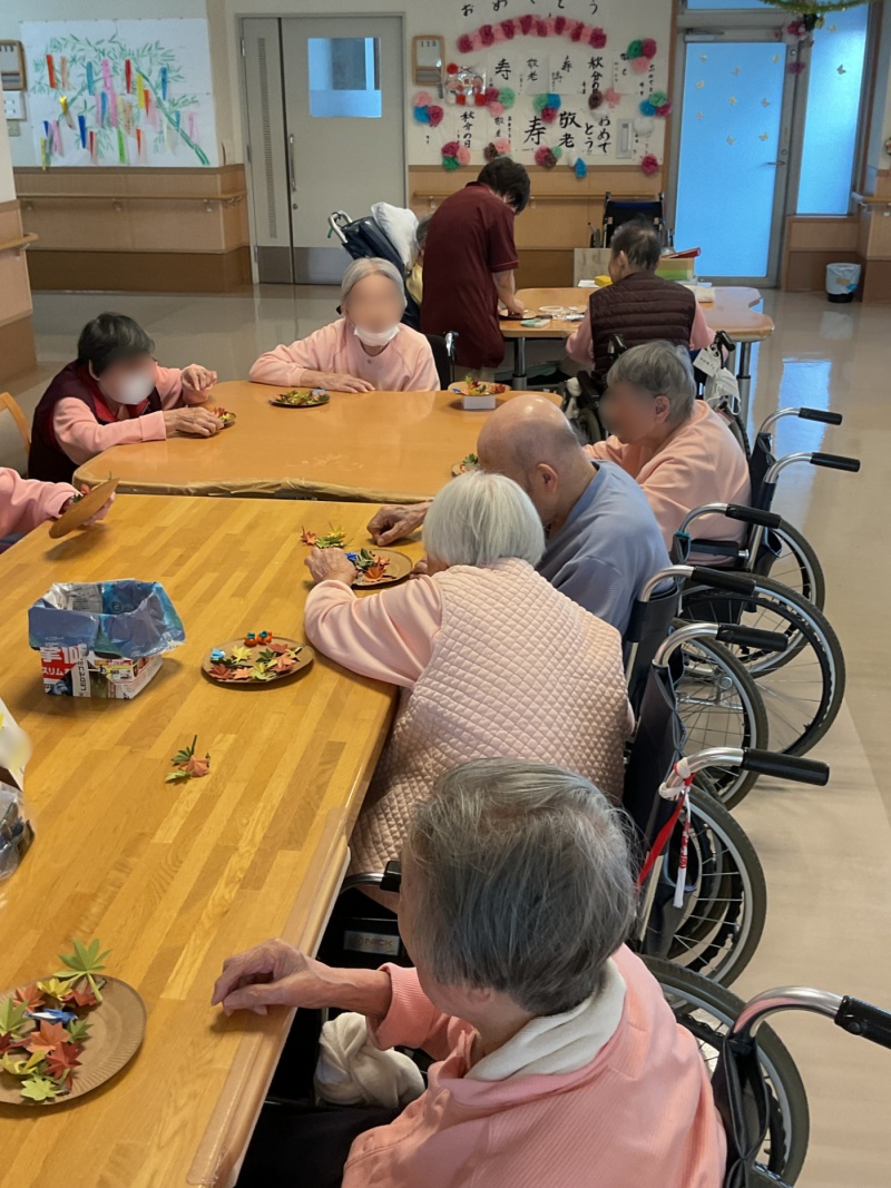 今月初めに2Fの美術クラブでは、紙皿を使った紅葉の作品を作りました。 紙皿に貼る前にモミジの形に紙を広げる作業がありましたが、指先を動かすとても良い運動になっていました。作業中は皆さん集中して取り組まれていましたよ。