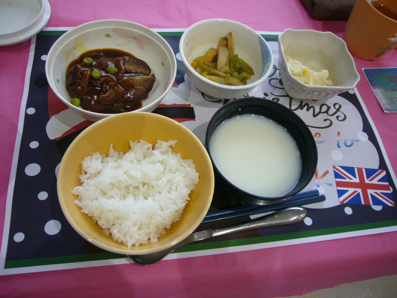 昼食メニューは、~煮込みハンバーグ、ピーマンソテー、ポテトサラダ、ポータジュスープ、ご飯~でした。ハンバーグはデミグラスソースで美味しいと言っていただけましたよ。
