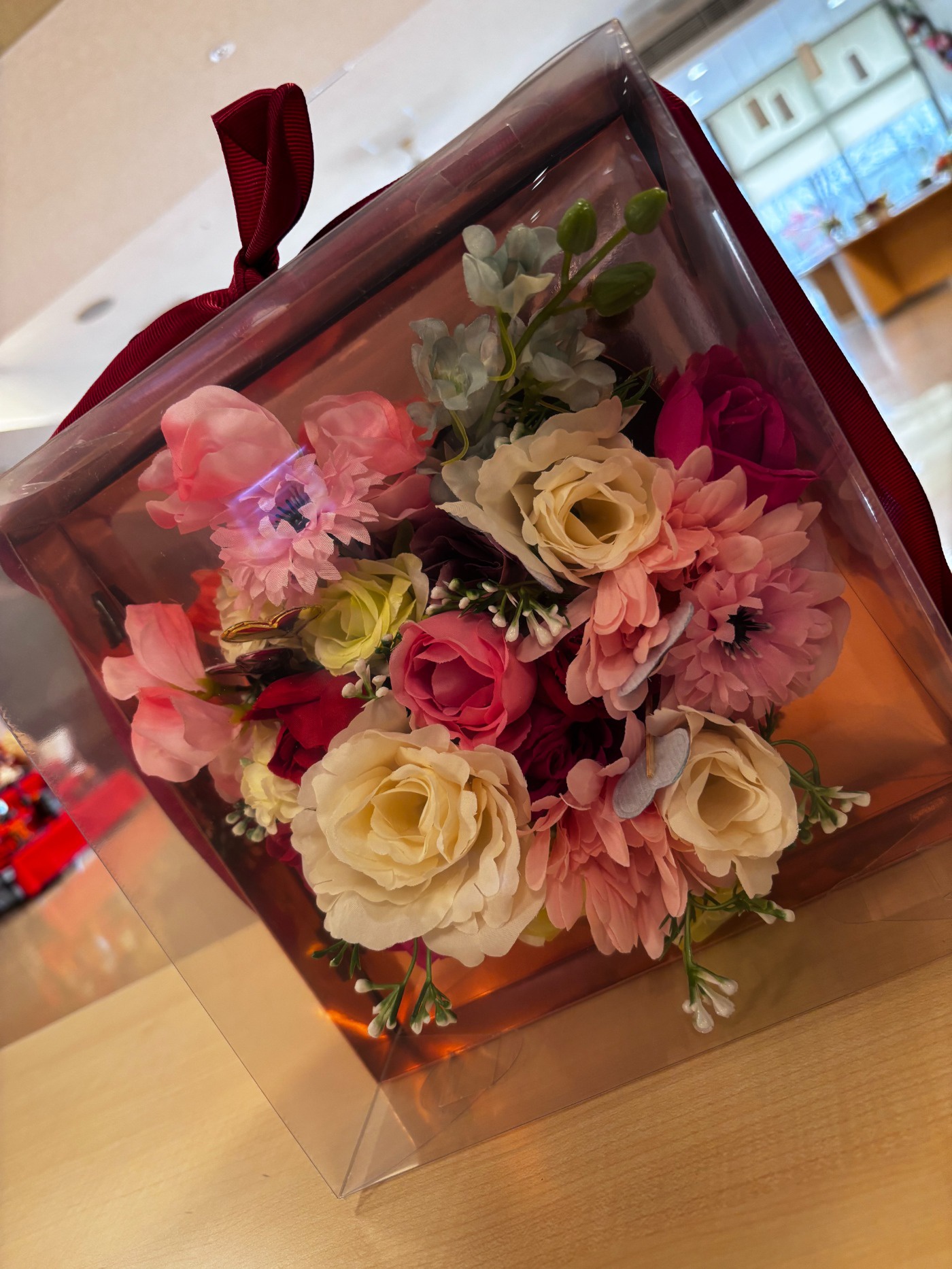 バレンタイン用に造ってくれたハート形のアレンジメントです。箱に入って本物の商品の様な完成度にびっくりしました。
