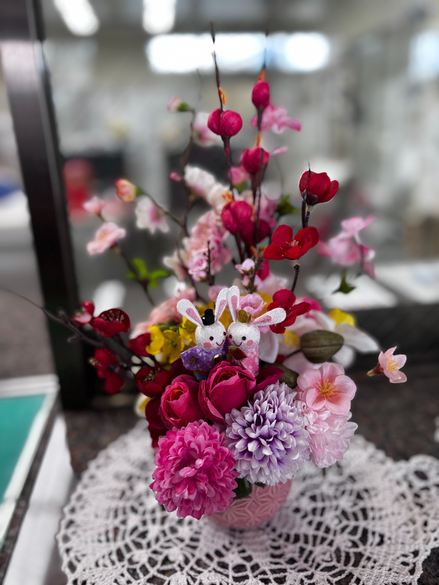 こちらは、ひな祭り用に造ってくれた物です。 梅の花やダリアの中に小さなウサギの男雛と女雛が寄り添っていて、とっても可愛いです。