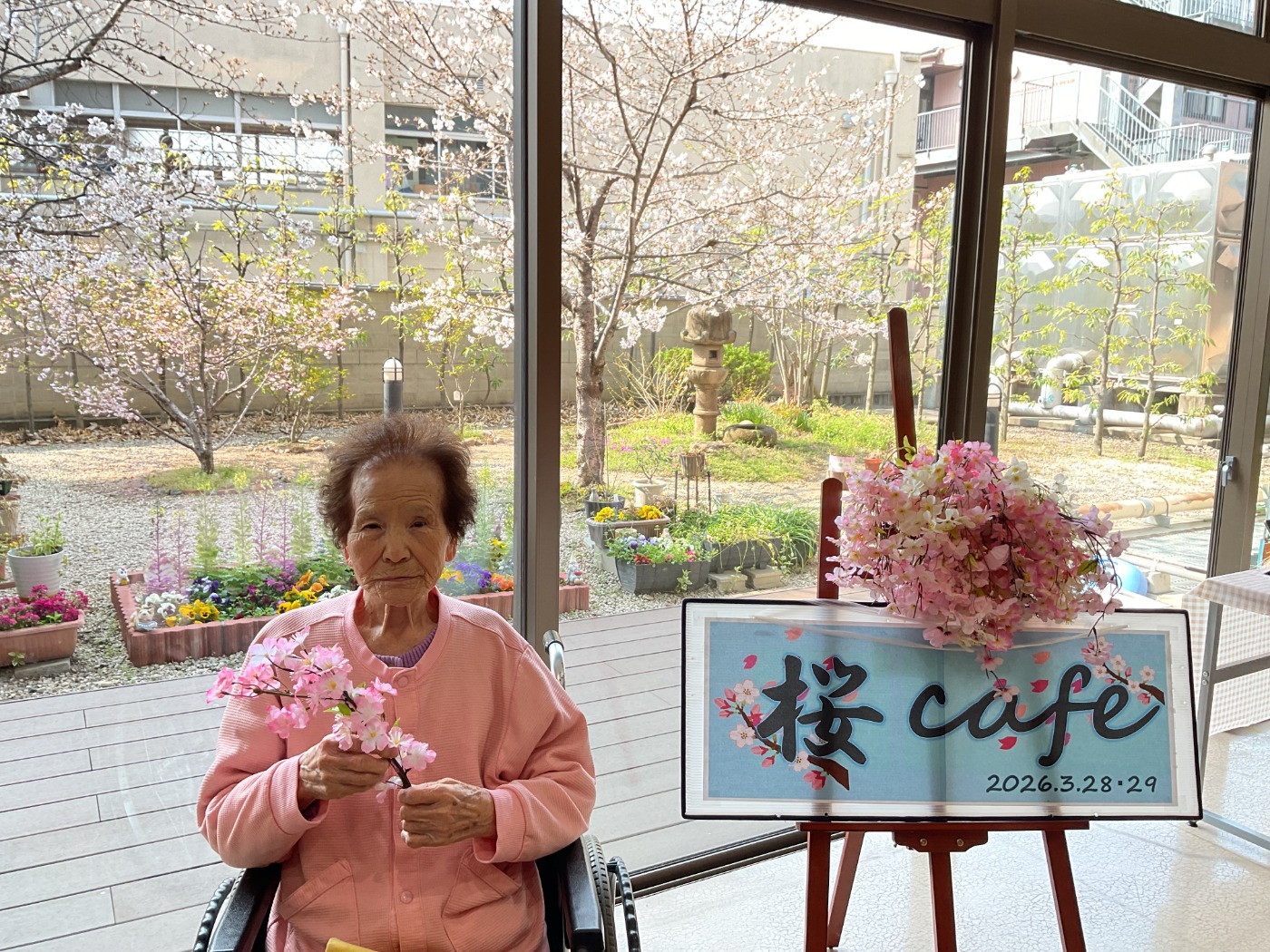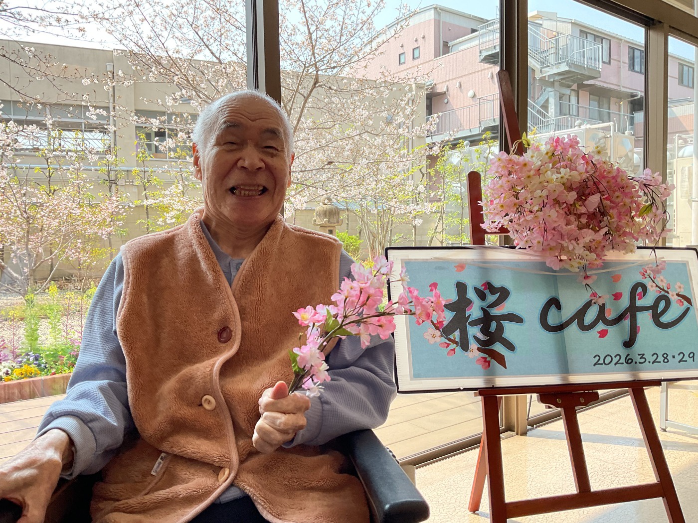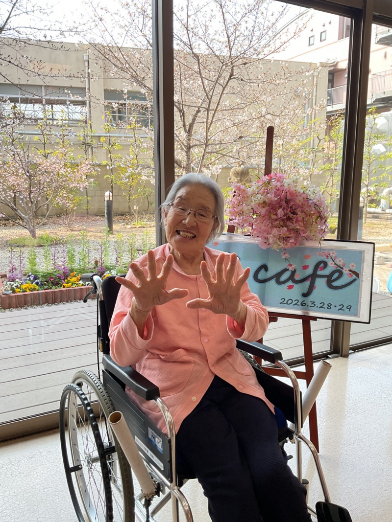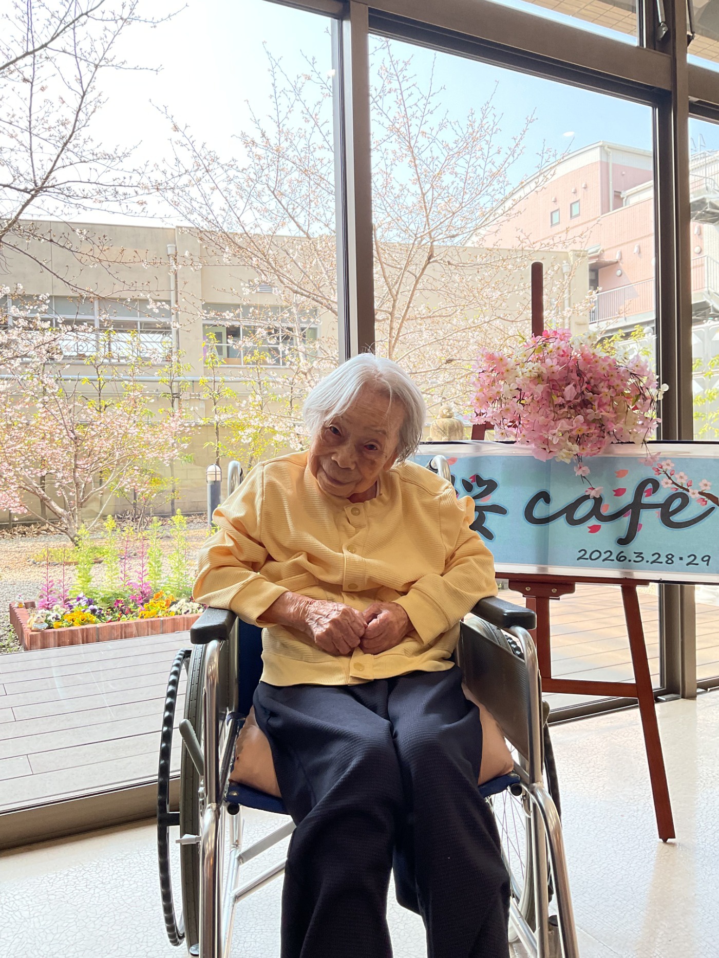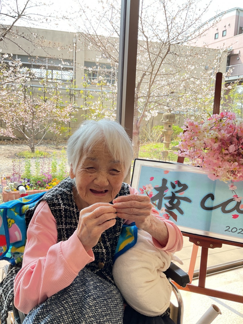 桜はまだ満開前でしたが、先月末に中庭が見えるロビーで桜カフェを開きました。 お茶の前に記念撮影をさせていただきましたが、皆さん素敵な笑顔をたくさん見せてくださいました。