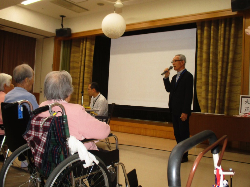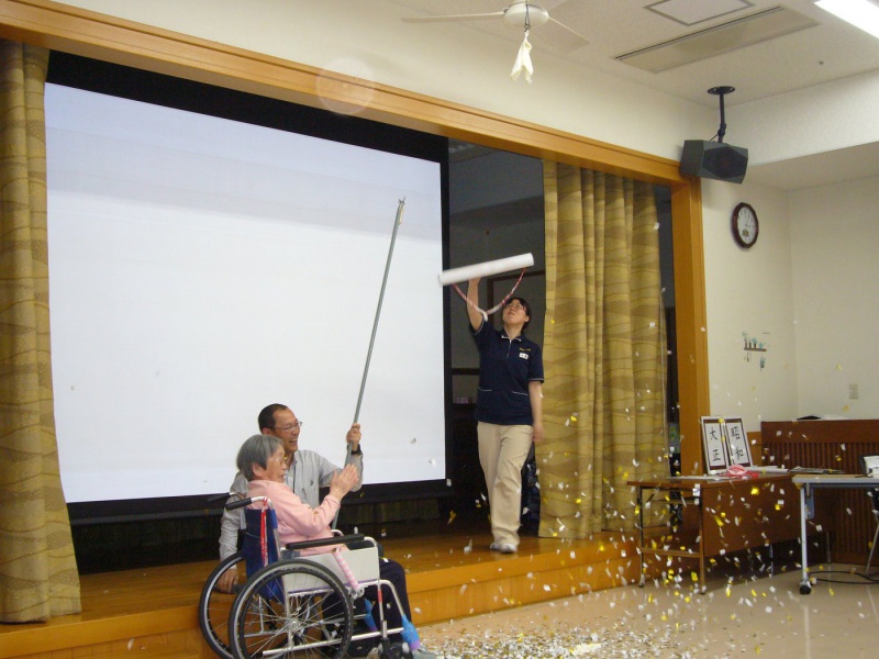 当苑で一番の年長者の101歳の方に代表で、くす玉に見立てた風船を割っていただきました。中に金と銀の紙吹雪がたくさん入っていたので、割れた時にとてもきれいでした。