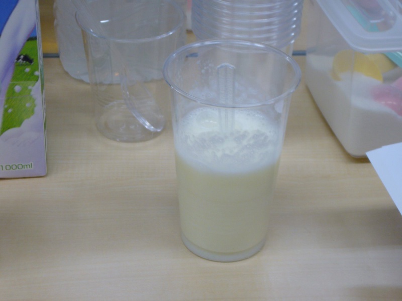濃いトロミのついた牛乳です。スプーンが立つ位のしっかりしたトロミがついていますね。使用しているトロミ剤は少量でしっかりトロミがつくタイプなので添加量が少なくて済み、味や風味が変化しにくいのですが、牛乳は少し甘く感じられ普通の牛乳が飲めない方もトロミがつくと飲めるという方もいらっしゃるそうです。