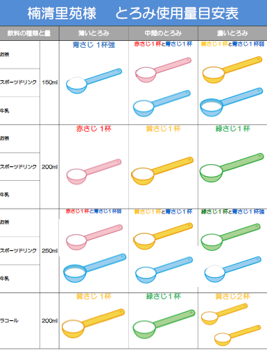 コップの大きさと飲料に対して正確な濃度のトロミが作れるように、先生が表を作って下さいました。これを見れば誰がやっても同じ濃度で作れるので、分かりやすくてとても助かります。