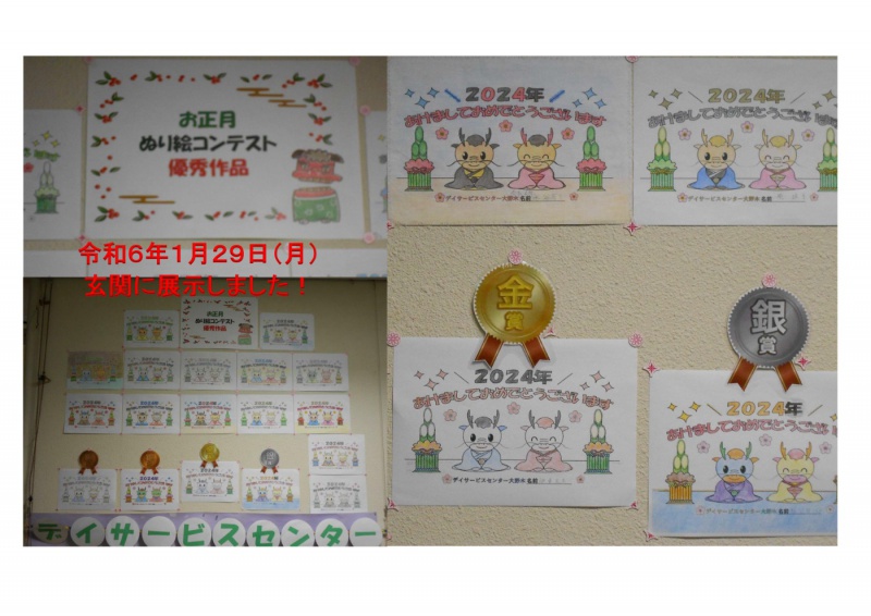 デイサービスセンター大野木 1/29 お正月ぬり絵コンテスト優秀作品の展示
